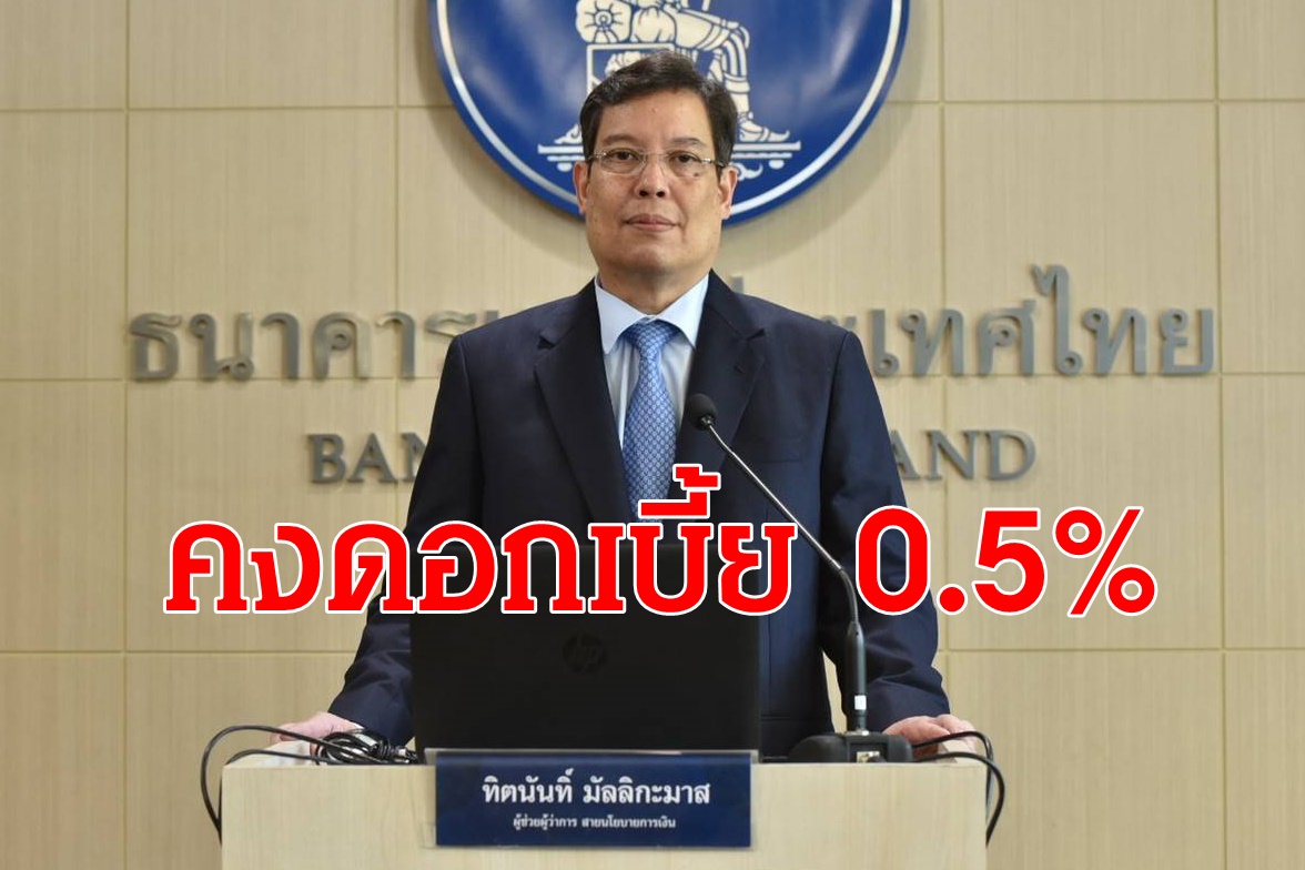 นายทิตนันทิ์ มัลลิกะมาส ผู้ช่วยผู้ว่าการ สายนโยบายการเงิน ธนาคารแห่งประเทศไทย (ธปท.) เลขานุการ คณะกรรมการนโยบายการเงิน (กนง.) เปิดเผยว่า คณะกรรมการฯ มีมติเอกฉันท์ให้คงอัตราดอกเบี้ยนโยบายอยู่ที่ 0.50% ต่อปี