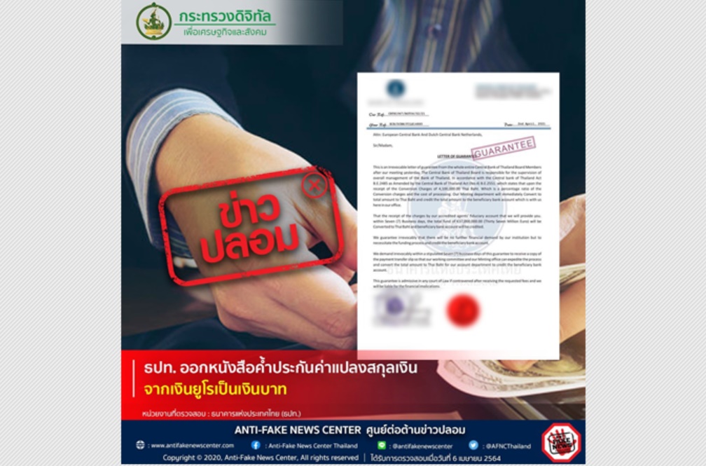 จากกรณีการส่งต่อข้อความชวนเชื่ออ้างถึงเอกสารธนาคารแห่งประเทศไทย โดยระบุเป็นภาษาอังกฤษว่ามีการออกหนังสือค้ำประกันค่าแปลงสกุลเงินจากเงินยูโรเป็นเงินบาทนั้น ทางธนาคารแห่งประเทศไทย (ธปท.) ได้ตรวจสอบและชี้แจงว่า เป็นเอกสารจากมิจฉาชีพ ไม่ใช่เอกสารจริงโดยหน่วยงานธปท. ไม่เคยออกหนังสือค้ำประกัน (Letter of Guarantee: LG) ให้กับส่วนงานใดๆ หรือ หน่วยงานใดๆ โปรดอย่าหลงเชื่ออาจทำให้สูญเสียข้อมูล และทรัพย์สินได้