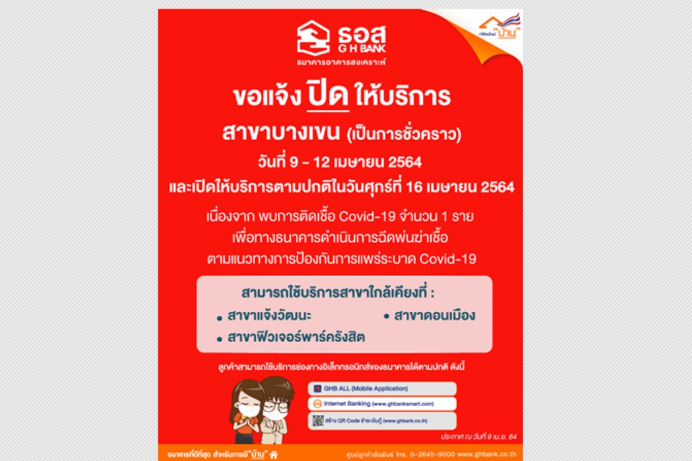 ธนาคารอาคารสงเคราะห์ ได้รับรายงานว่า วันนี้(ศุกร์ที่ 9 เมษายน 2564) มีพนักงาน 1 ราย ของธนาคารอาคารสงเคราะห์ สาขาบางเขน ได้รับการแจ้งยืนยันผลการตรวจจากแพทย์ว่าติดเชื้อ COVID-19 เพื่อความปลอดภัยของผู้ใช้บริการ และผู้ปฏิบัติงาน ธนาคารจึงสั่งปิดให้บริการสาขาบางเขนเป็นการชั่วคราวตั้งแต่วันที่ 9-12 เมษายน 2564 เพื่อทำความสะอาดแบบ Big cleaning ฉีดพ่นฆ่าเชื้อ ตามแนวทางของกระทรวงสาธารณสุข และจะเปิดให้บริการปกติในวันศุกร์ที่ 16 เมษายน 2564 โดยมีพนักงานชุดใหม่เข้าไปปฏิบัติหน้าที่แทน