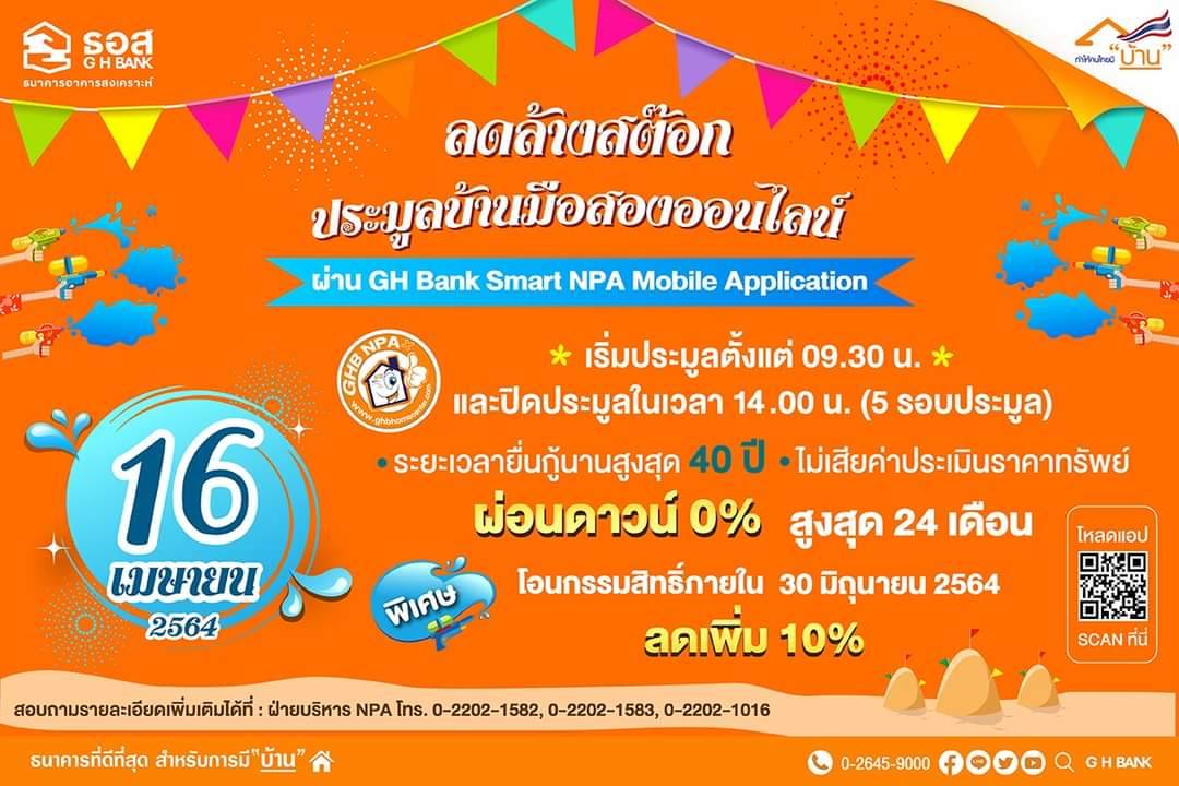 ธนาคารอาคารสงเคราะห์ ลดล้างสต๊อก เอาใจคนอยากมีบ้าน พร้อมร่วมดูแลสังคม ให้ห่างไกล COVID-19 ด้วยการคัดบ้านมือสอง สภาพดี คุ้มราคา ทั่วประเทศ รวม 4,360 รายการ มาเปิดประมูลแบบออนไลน์ครั้งพิเศษในเดือนเมษายน 2564 ผ่าน Application : G H Bank Smart NPA ลดสูงสุด ถึง 40% จากราคาปกติ ราคาเริ่มต้นประมูลต่ำสุดเพียง 45,000 บาทเท่านั้น พิเศษ!! มอบส่วนลดเพิ่ม อีก10% จากราคาที่ปิดประมูลหากทำสัญญา และทำนิติกรรมภายในวันที่ 30 มิถุนายน 2564 พร้อมโปรโมชั่นผ่อนดาวน์ 0% นาน 24 เดือน เริ่มประมูลพร้อมกัน 16 เมษายน 2564 แบ่งเป็น 5 รอบ เริ่มรอบแรก 09.30 น.