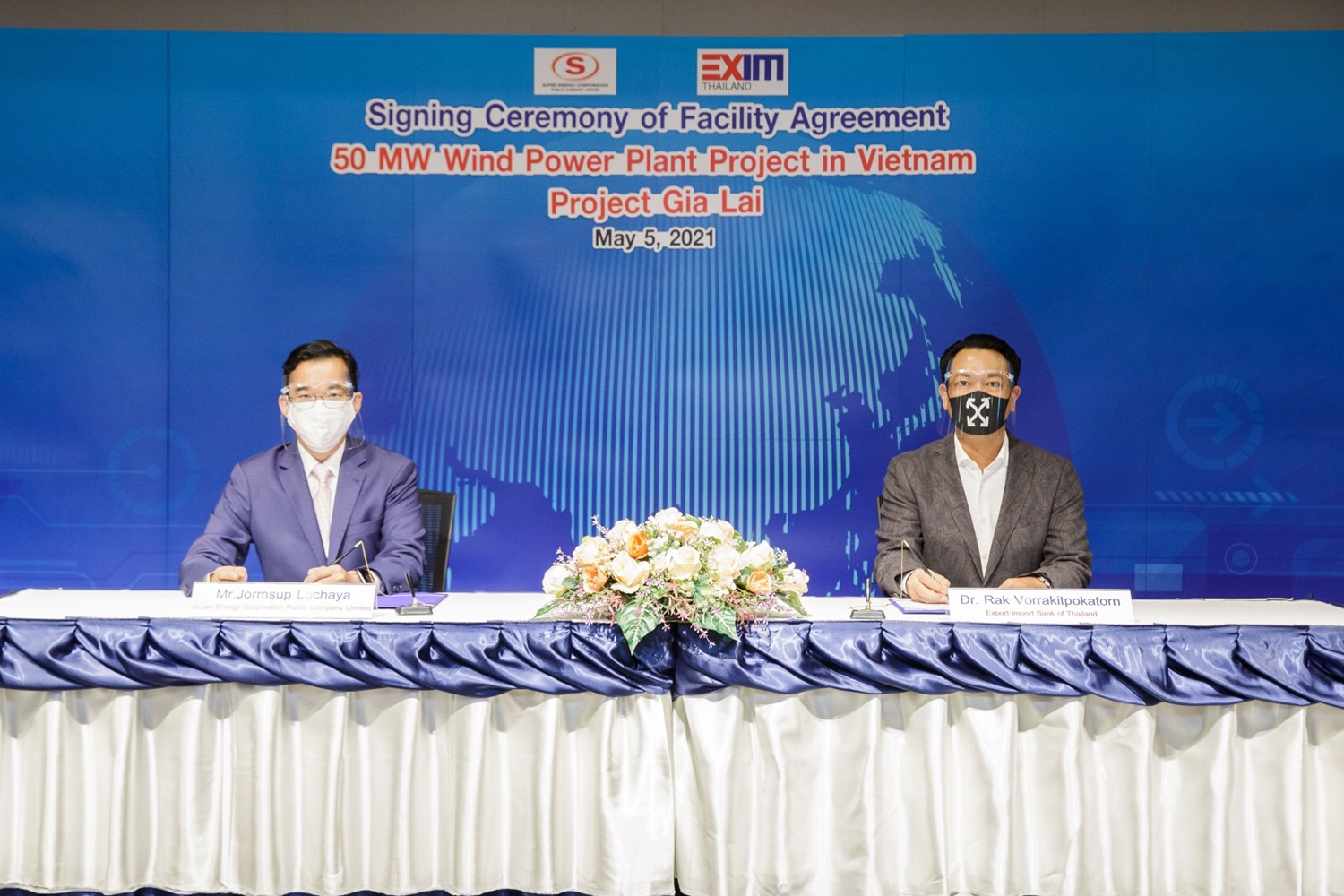 ดร.รักษ์ วรกิจโภคาทร กรรมการผู้จัดการ ธนาคารเพื่อการส่งออกและนำเข้าแห่งประเทศไทย (EXIM BANK) และนายจอมทรัพย์ โลจายะ ประธานเจ้าหน้าที่บริหาร บริษัท ซุปเปอร์ เอนเนอร์ยี คอร์เปอเรชั่น จำกัด (มหาชน) (SUPER) ร่วมลงนามในสัญญาสนับสนุนทางการเงินของ EXIM BANK จำนวน 73.95 ล้านดอลลาร์สหรัฐ หรือประมาณ 2,300 ล้านบาท เพื่อสนับสนุนการลงทุนก่อสร้างโรงไฟฟ้าพลังงานลม กำลังการผลิต 50 เมกะวัตต์ ที่จังหวัดยาไล ประเทศเวียดนาม ณ EXIM BANK สำนักงานใหญ่ เมื่อเร็ว ๆ นี้