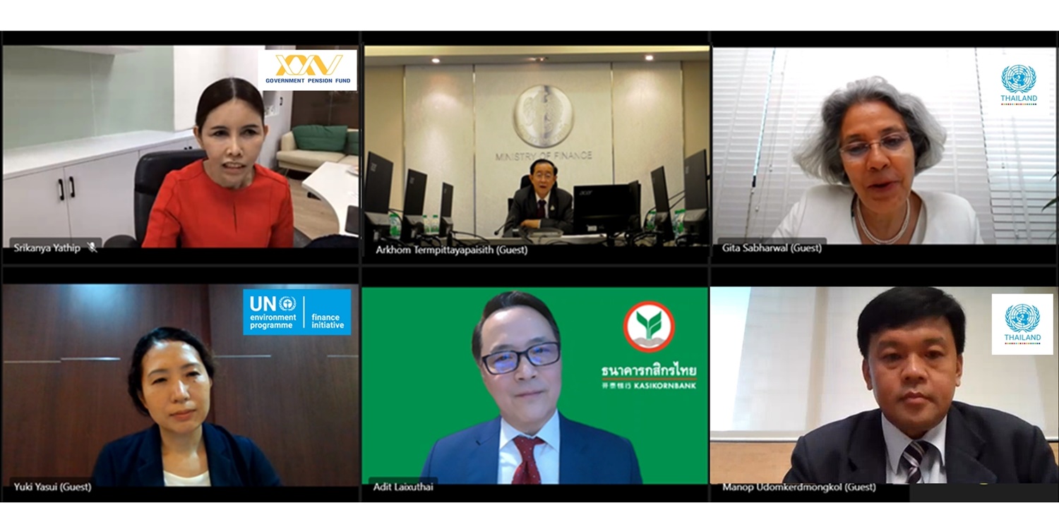 โดยมี ดร.ศรีกัญญา ยาทิพย์ เลขาธิการคณะกรรมการกองทุนบำเหน็จบำนาญข้าราชการ (กบข.) นางกีต้า ซับบระวาล ผู้ประสานงานสหประชาชาติประจำประเทศไทย (The United Nations Resident Coordinator) นางสาวยูกิ ยาสุอิ ผู้จัดการประสานงานภูมิภาคเอเชียแปซิฟิก สำนักงานโครงการสิ่งแวดล้อมแห่งสหประชาชาติว่าด้วยข้อริเริ่มทางการเงิน (UNEP Finance Initiative: UNEP FI) ดร.มานพ อุดมเกิดมงคล นักเศรษฐศาสตร์ สำนักงานผู้ประสานงานสหประชาชาติประจำประเทศไทย และ ดร.อดิศวร์ หลายชูไทย รองกรรมการผู้จัดการอาวุโสธนาคารกสิกรไทย จำกัด (มหาชน) เข้าร่วมหารือเมื่อวันที่ 13 พฤษภาคม 2564