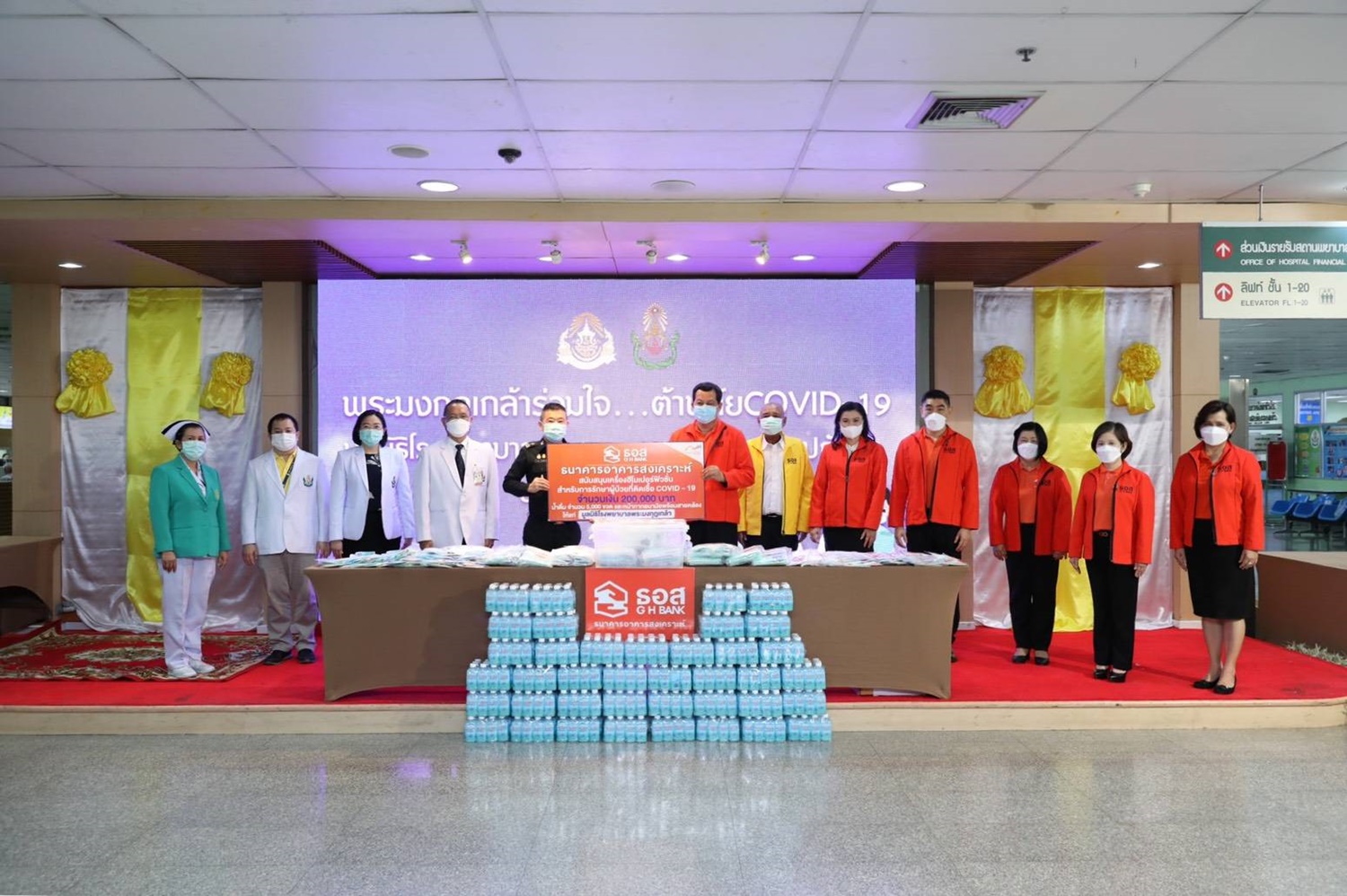2. มอบเงินสนับสนุน จำนวน 200,000 บาท ให้แก่โรงพยาบาลพระมงกุฎเกล้า สำหรับการจัดหาเครื่อง ฮีโมเปอร์ฟิวชั่น จำนวน 1 เครื่อง สำหรับใช้ในการรักษาผู้ป่วย COVID-19 ซึ่งถือเป็นเครื่องมือที่มีประสิทธิภาพสูงในการช่วยลดอาการปอดอักเสบรุนแรงที่เกิดจากภูมิคุ้มกันต่อต้านไวรัส COVID-19 มากเกินไป พร้อมน้ำดื่มธนาคารจำนวน 5,000 ขวด รวมถึงหน้ากากอนามัยและสายคล้องที่จัดทำโดยพนักงานจิตอาสาของธนาคาร โดยมี พลตรีวิเชษฐ์ รัตนจรัสโรจน์ หัวหน้าสำนักงานผู้บังคับบัญชาโรงพยาบาลพระมงกุฎเกล้า เป็นผู้รับมอบ