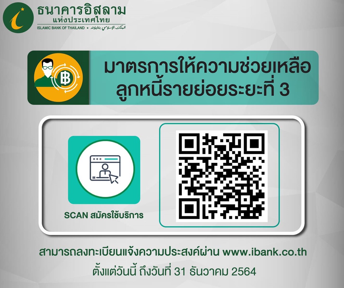 ธนาคารอิสลามแห่งประเทศไทย (ไอแบงก์) พร้อมเปิดระบบให้ลูกค้าสแกน คิวอาร์โค้ด ลงทะเบียน เข้าร่วมมาตรการให้ความช่วยเหลือลูกหนี้รายย่อย ระยะที่ 3 เพื่อช่วยเหลือลูกหนี้รายย่อยประเภทสินเชื่อบุคคล สินเชื่อที่อยู่อาศัยและสินเชื่อเช่าซื้อรถยนต์ ที่ได้รับผลกระทบจากการแพร่ระบาดของเชื้อไวรัสโควิด – 19 ระลอกใหม่ ครอบคลุมลูกค้าที่ได้รับผลกระทบระยะสั้นและระยะยาว โดยมาตรการนี้มีแนวทางให้ความช่วยเหลือ ดังนี้