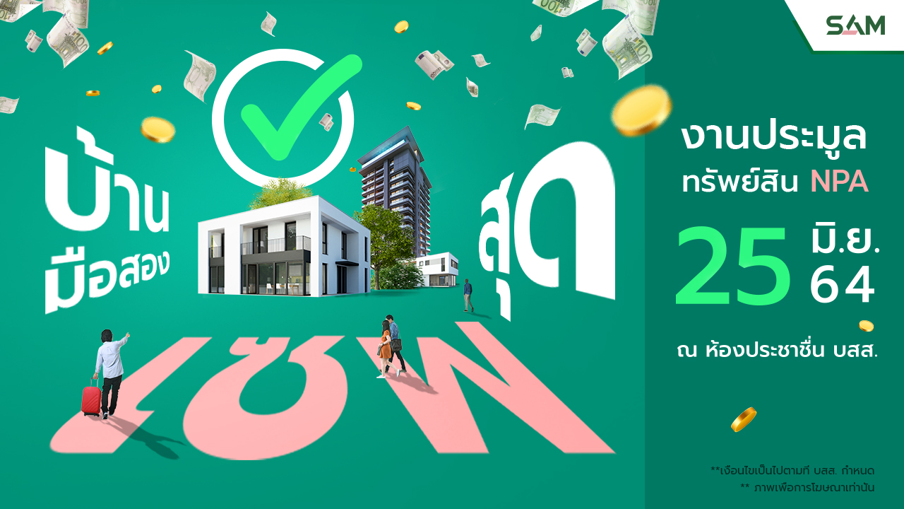 นายธรัฐพร เตชะกิจขจร ผู้จัดการ บริษัท บริหารสินทรัพย์สุขุมวิท จำกัด (บสส.) หรือ SAM เผยว่า SAM พร้อมจัดงานประมูลทรัพย์สินรอการขาย (NPA) ผ่านช่องทางอออนไลน์อย่างต่อเนื่องในเดือนมิถุนายน 2564 เตรียมคัดอสังหาริมทรัพย์มือสองทั่วไทย เปิดโอกาสการลงทุนแก่นักลงทุนรายย่อยและรายใหญ่ออกประมูล มูลค่ารวมทั้งสิ้นประมาณ 500 ล้านบาท โดยกำหนดจัดงานใน วันศุกร์ที่ 25 มิถุนายน 2564 ณ สำนักงานใหญ่ของ SAM อาคารซันทาวเวอร์ส บี ชั้น 24 ถ.วิภาวดีรังสิต