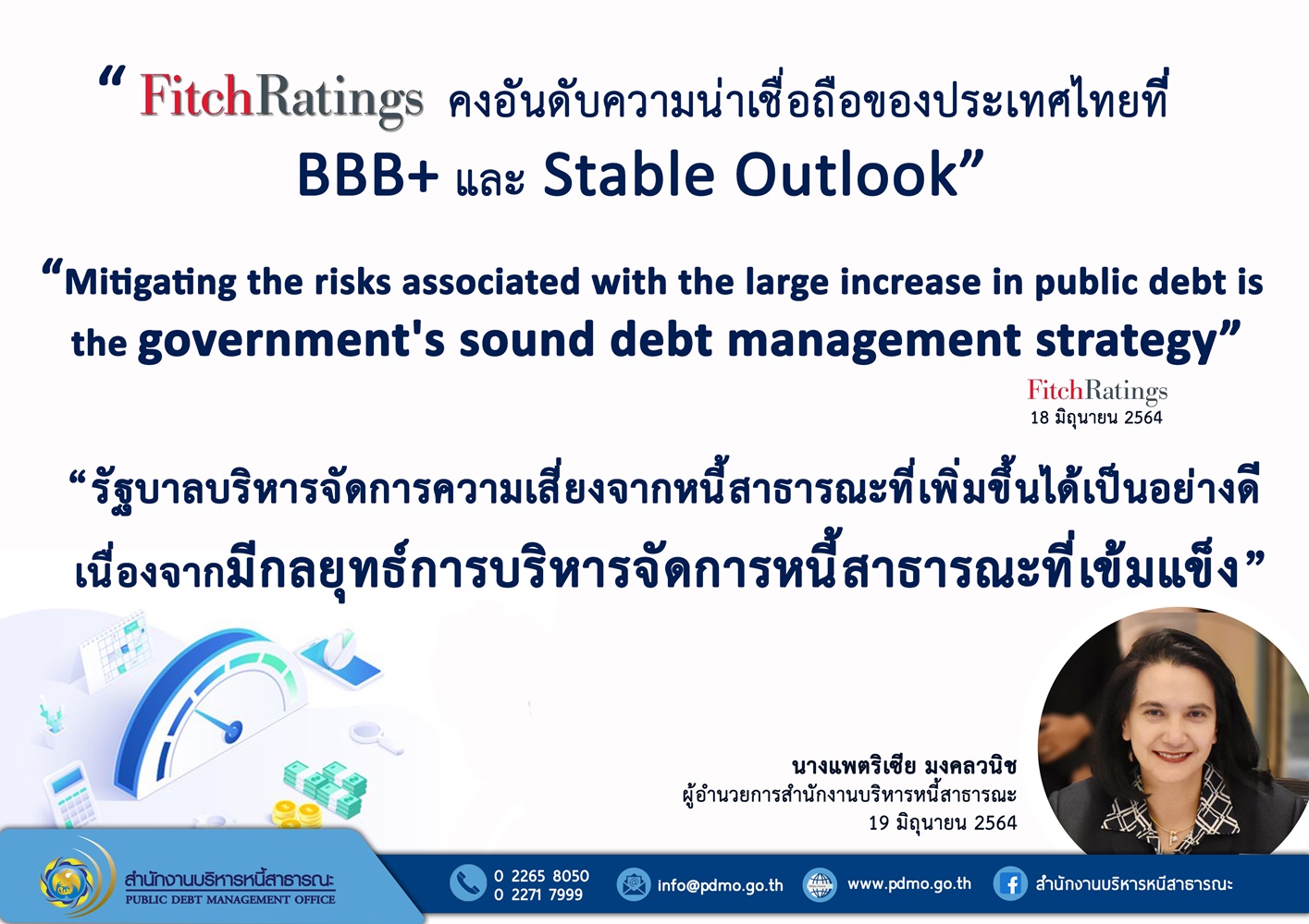 นางแพตริเซีย มงคลวนิช ผู้อำนวยการสำนักงานบริหารหนี้สาธารณะ เปิดเผยว่า เมื่อวันที่ 18 มิถุนายน 2564 บริษัท Fitch Ratings (Fitch) ได้คงอันดับความน่าเชื่อถือของประเทศไทย (Sovereign Credit Rating) ที่ BBB+ และคงมุมมองความน่าเชื่อถือของประเทศไทย (Outlook) อยู่ในระดับมีเสถียรภาพ (Stable Outlook) โดยมีรายละเอียดดังนี้