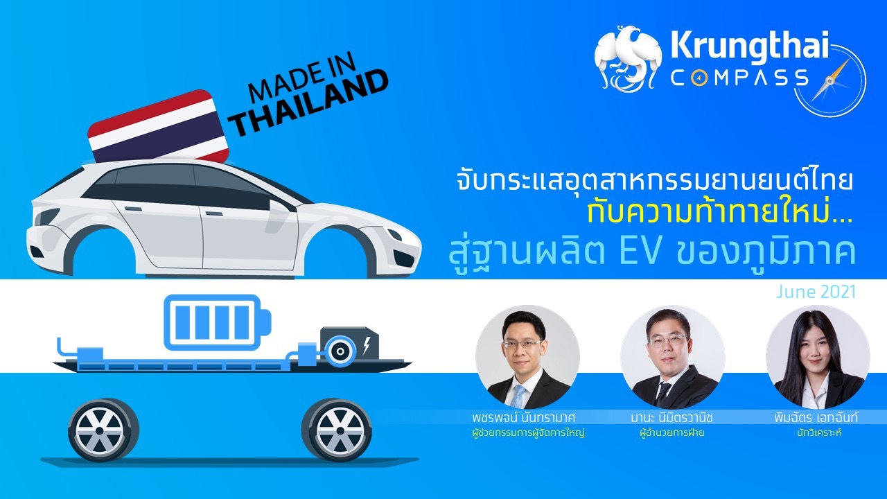 ดร.มานะ นิมิตรวานิช ผู้อำนวยการฝ่าย ศูนย์วิจัย Krungthai COMPASS กล่าวว่า สำหรับประเทศไทยนั้น ด้วยยอดใช้ยานยนต์ไฟฟ้าสะสมในประเทศ ณ สิ้นปี 2563 อยู่ที่เพียง 1.9 แสนคัน หรือคิดเป็น 1% ของยานยนต์ทั้งหมด ถือว่ายังมีขนาดเล็กและอยู่ในช่วงเริ่มต้นเมื่อเทียบกับประเทศชั้นนำอื่นๆ อย่างไรก็ดี ข้อได้เปรียบของไทยในการเป็นฐานผลิตยานยนต์เครื่องยนต์ ICE แบบดั้งเดิมมาอย่างยาวนาน ประกอบกับกลยุทธ์การทำตลาดของผู้ผลิตยานยนต์ OEM ในประเทศที่ยังคงเน้นทำตลาดยานยนต์ไฟฟ้าไฮบริดตามบริษัทแม่ในญี่ปุ่น จะเป็นส่วนเสริมให้ยอดใช้ยานยนต์ไฟฟ้าสะสมในประเทศมีโอกาสแตะ 1 ล้านคันได้ในปี 2571 หรือขยายตัวเฉลี่ยราว 24% ต่อปี จากยอดใช้ยานยนต์ไฟฟ้าไฮบริดที่คาดว่าจะมีสัดส่วนสูงถึง 93% ของยานยนต์ไฟฟ้าทั้งหมด ทั้งนี้ Krungthai COMPASS ชี้ว่ามาตรการภาครัฐที่สนับสนุนทั้งผู้ผลิต ผู้ประกอบการ และผู้บริโภค จะเป็นส่วนสำคัญให้อุตสาหกรรมยานยนต์ของไทยมีโอกาสต่อยอดเป็นฐานผลิตยานยนต์ไฟฟ้าไฮบริดที่แข็งแกร่งของภูมิภาคในอนาคตต่อไป