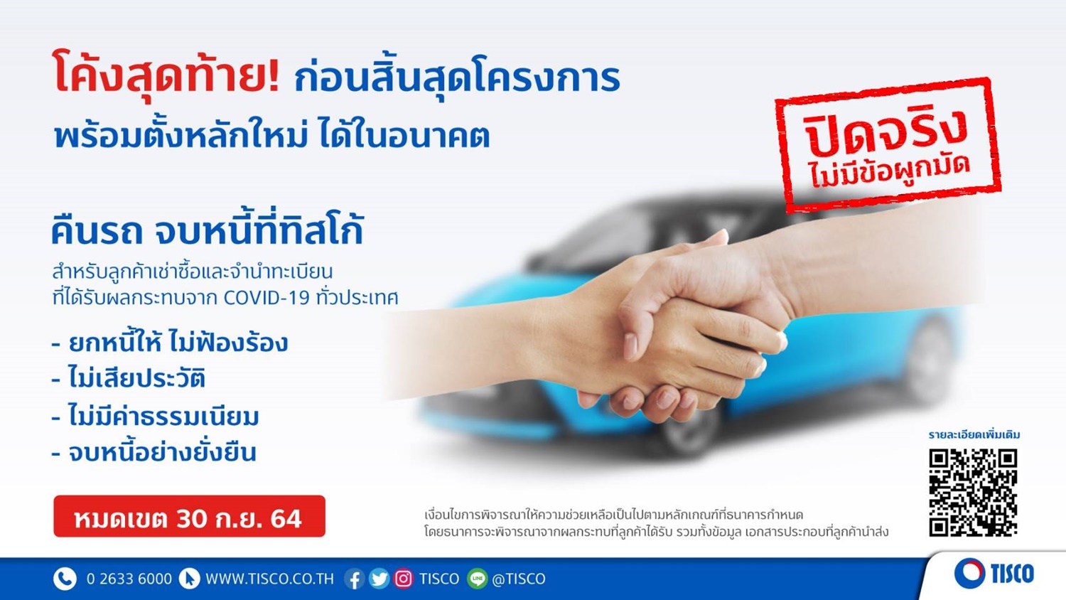 ทั้งนี้ ยืนยันว่า โครงการนี้ธนาคารจะเป็นผู้รับผิดชอบโดยการ “ยกหนี้ให้จริง” ภายใต้เงื่อนไขที่กำหนด และขอย้ำว่า ธนาคารจะไม่ดำเนินการฟ้องร้องเรียกค่าเสียหายเพิ่มเติม ไม่คิดค่าธรรมเนียม พร้อมระบุสถานะเป็นลูกค้า “ปิดบัญชี” นั่นหมายความว่า ลูกค้าจะไม่เสียประวัติทางการเงิน และไม่มีหนี้หลังจากคืนรถ ทำให้ในอนาคตหากลูกค้ามีความจำเป็นทางการเงินก็มีโอกาสกลับมาขอสินเชื่อใหม่ได้อีก นั่นคือ วัตถุประสงค์ของโครงการที่ตั้งใจเข้าไปช่วยแก้ปัญหาให้ลูกค้าได้อย่างเบ็ดเสร็จ ถือว่าเป็นผลดีกับลูกค้ามากกว่าการปล่อยให้รถถูกยึด ลูกค้าสามารถลงทะเบียนเข้าร่วมโครงการได้ที่ www.tisco.co.th รวมถึงติดตามข่าวสารผ่านช่องทางดังกล่าวและที่ Line @TISCO / Facebook Fanpage TISCO หรือสอบถามรายละเอียดเพิ่มเติม โทร. 0 2633 6000 หรือ 0 2080 6000