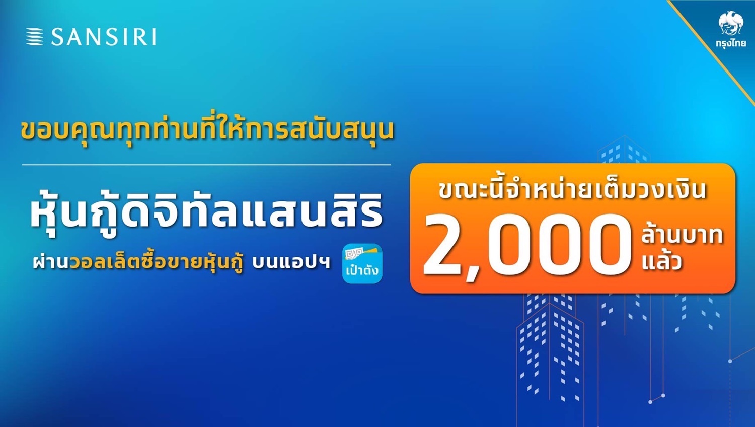 หุ้นกู้ดิจิทัลแสนสิริ ขายครบ 2,000 ล้านบาท ภายใน 3นาที 38 วินาที