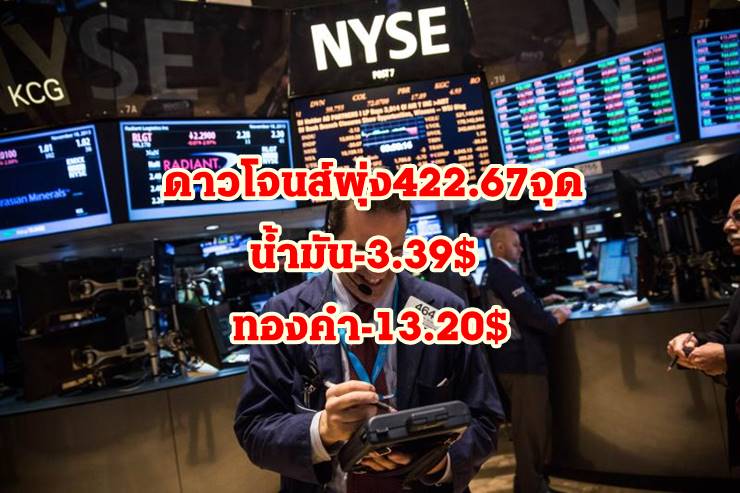 หุ้นดาวโจนส์ปิดพุ่ง 422.67 จุด ด้านราคาน้ำมันร่วงแรง 3.39 ดอลลาร์ ขณะที่ทองคำลบ 13.20 ดอลลาร์ ตลาดคลายกังวลสถานการณ์ในยูเครน