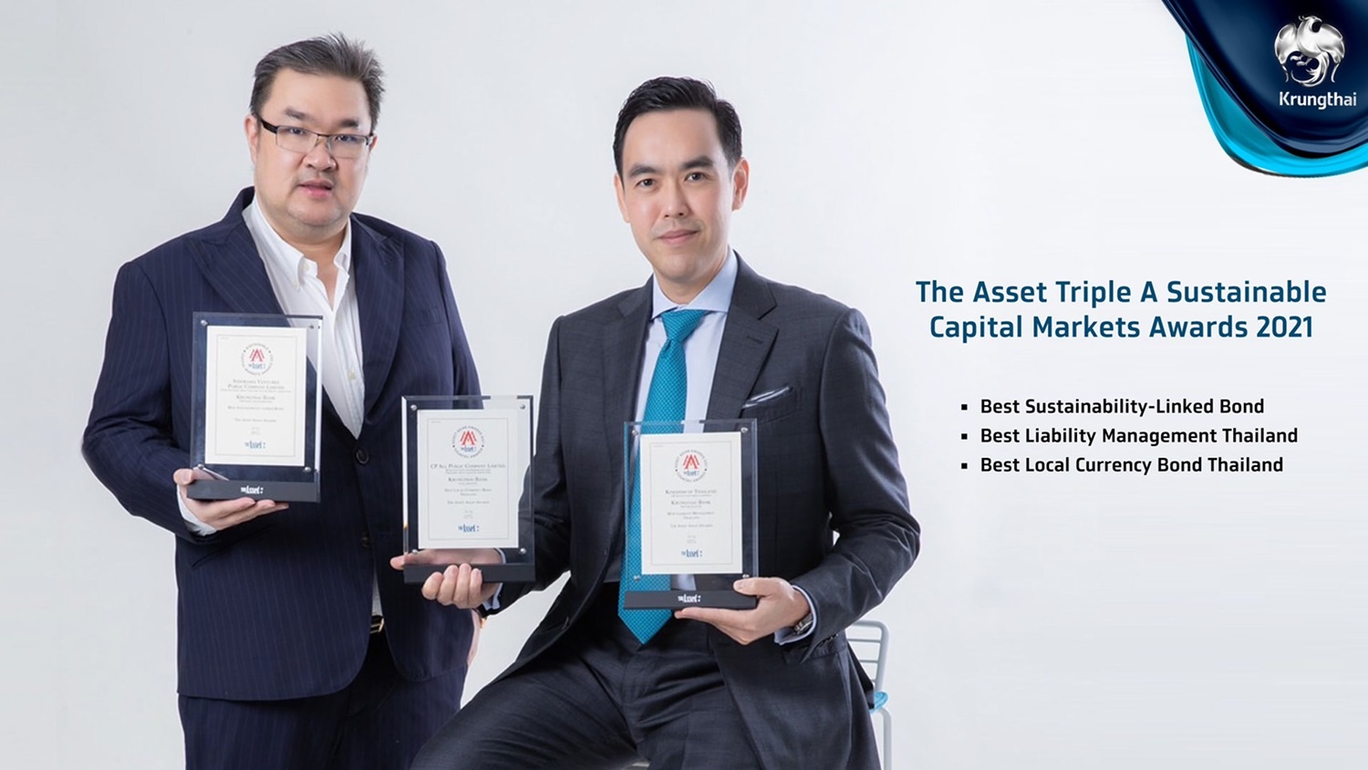นายรวินทร์ บุญญานุสาสน์ รองกรรมการผู้จัดการใหญ่ และ นายกฤชกร นนทะนาคร ผู้อำนวยการฝ่ายอาวุโส ธนาคารกรุงไทย ประกาศความสำเร็จรับ 3 รางวัลทรงเกียรติจากงาน The Asset Triple A Sustainable Capital Markets Awards 2021 จัดโดยนิตยสาร The Asset นิตยสารการเงินชั้นนำแห่งเอเชีย ได้แก่ รางวัล Best Sustainability-Linked Bond รางวัล Best Liability Management Thailand และรางวัล Best Local Currency Bond Thailand จากการทำหน้าที่เป็นที่ปรึกษา ผู้จัดการการจัดสรรและการจัดจำหน่ายหุ้นกู้ของสถาบันต่างๆ โดยได้รับการตอบรับอย่างล้นหลาม