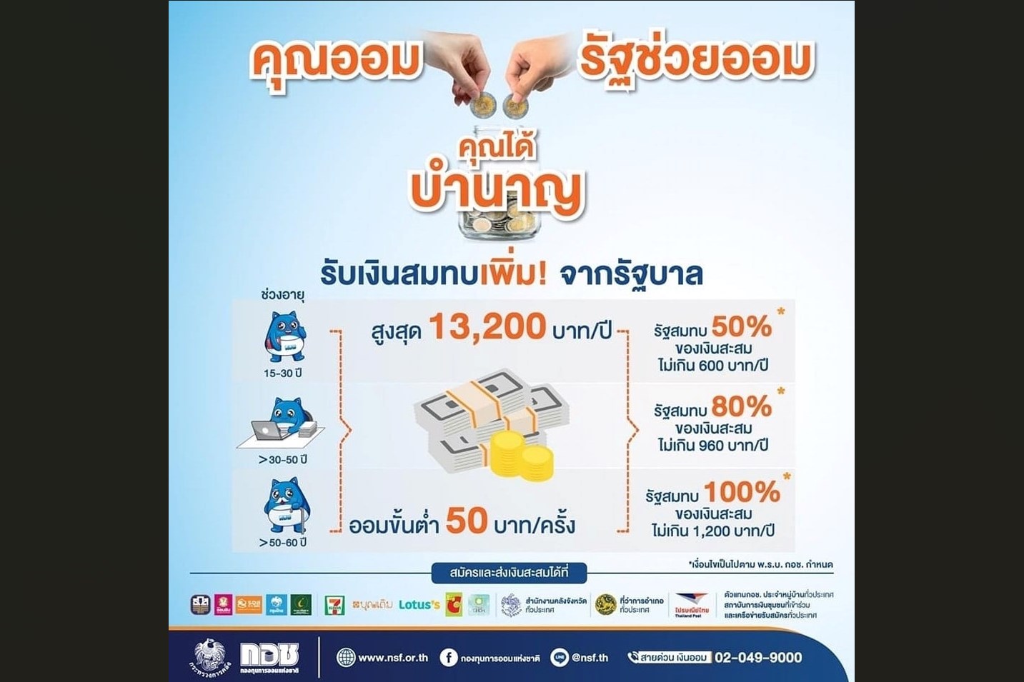 กอช. เชิญชวนผู้ประกอบอาชีพอิสระ ออมขั้นต่ำ 50 บาท สูงสุด 13,200 บาทต่อปี รับเงินรัฐสมทบสูงสุด 1,200 บาทต่อปี