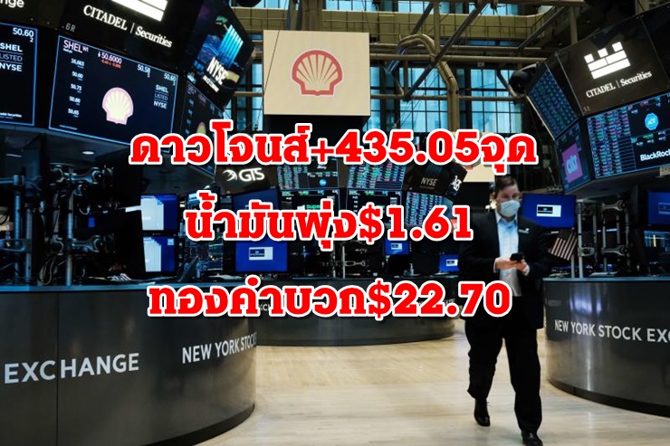 หุ้นดาวโจนส์ปิดบวก 435.05 จุด ด้านราคาน้ำมันพุ่ง 1.61 ดอลลาร์ ขณะที่ทองคำบวกแรง 22.70 ดอลลาร์