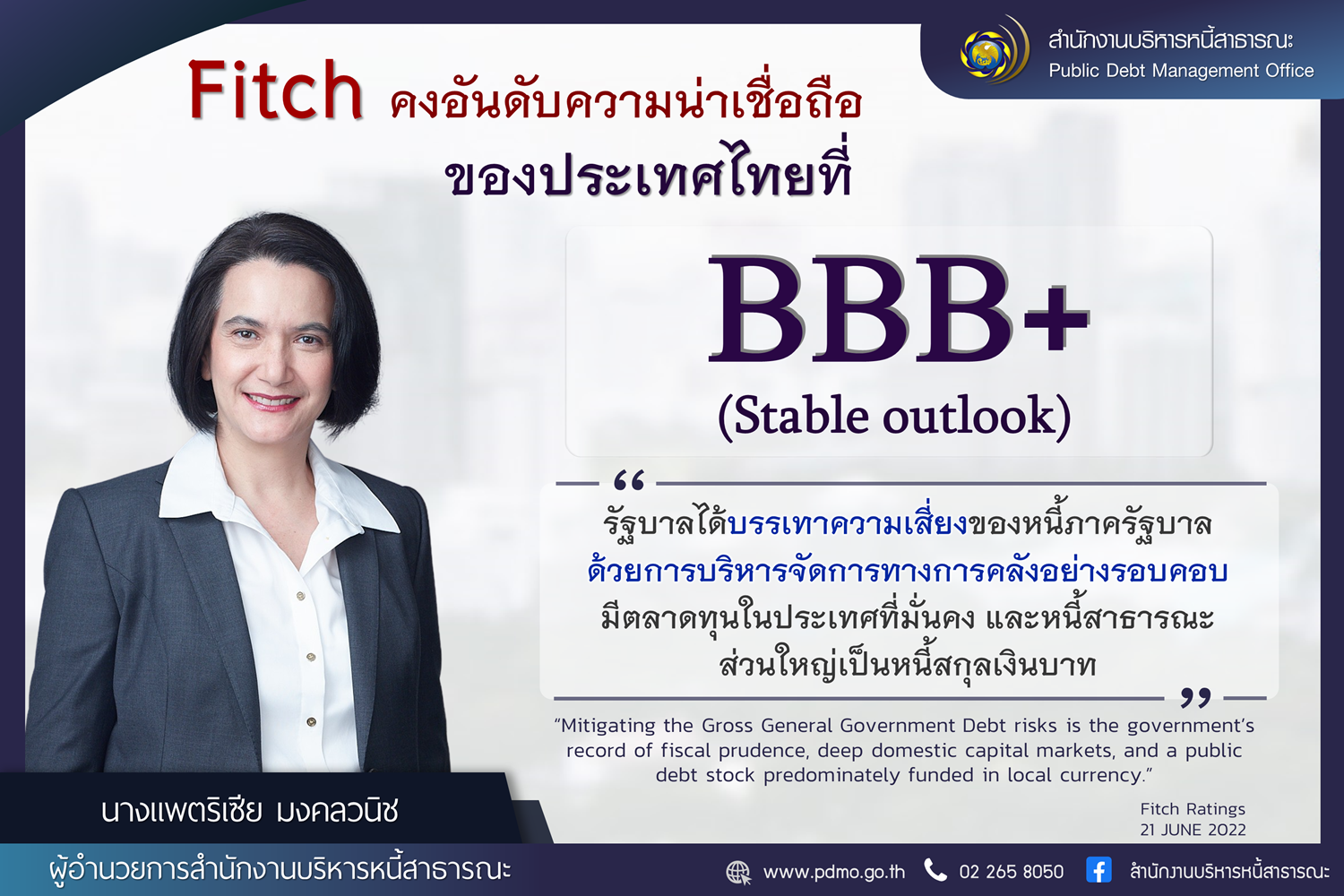 นางแพตริเซีย มงคลวนิช ผู้อำนวยการสำนักงานบริหารหนี้สาธารณะ เปิดเผยว่า เมื่อวันที่ 21 มิถุนายน 2565 บริษัท Fitch Ratings (Fitch) ได้คงอันดับความน่าเชื่อถือของประเทศไทย (Sovereign Credit Rating) ที่ BBB+ และคงมุมมองความน่าเชื่อถือของประเทศไทย (Outlook) อยู่ในระดับมีเสถียรภาพ (Stable Outlook) โดยมีรายละเอียด ดังนี้