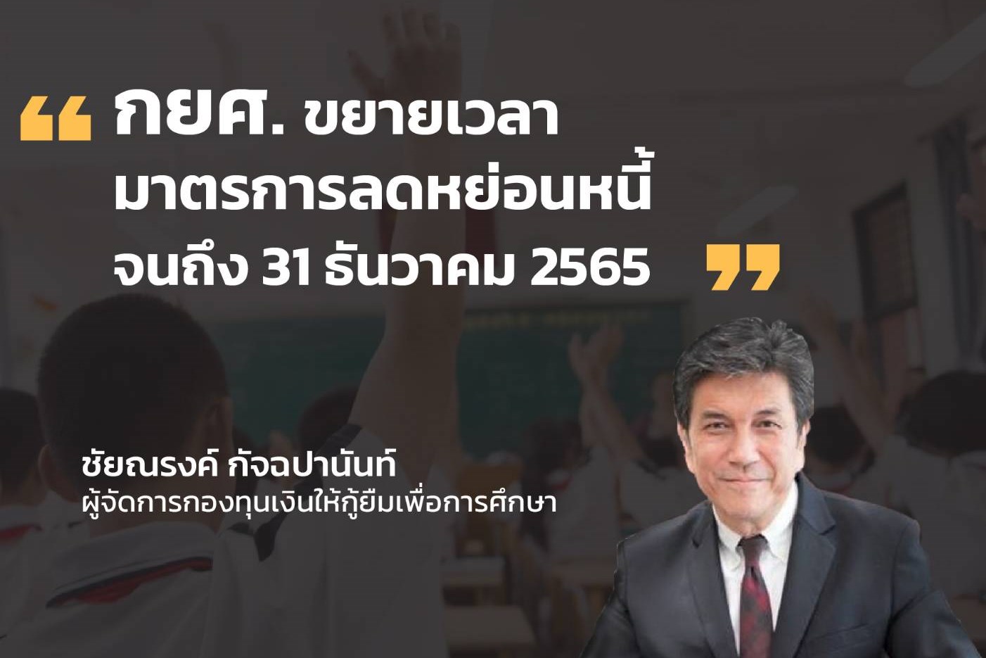 นายชัยณรงค์ กัจฉปานันท์ ผู้จัดการกองทุนเงินให้กู้ยืมเพื่อการศึกษา (กยศ.) เปิดเผยว่า “ในช่วงสถานการณ์โรคติดเชื้อไวรัสโคโรนา 2019 (COVID-19) ที่ผ่านมา กองทุนได้มีมาตรการลดหย่อนหนี้เพื่อเป็นการบรรเทาความเดือดร้อนของผู้กู้ยืมที่อยู่ระหว่างการชำระหนี้ที่ได้รับผลกระทบทางเศรษฐกิจ โดยขณะนี้ คณะกรรมการกองทุนฯ ได้เห็นชอบขยายระยะเวลามาตรการลดหย่อนหนี้ดังกล่าว เพื่อเป็นการจูงใจให้ผู้กู้ยืมมาชำระเงินคืน จากเดิมสิ้นสุดวันที่ 30 มิถุนายน 2565 เป็นสิ้นสุดวันที่ 31 ธันวาคม 2565 รวมระยะเวลา 6 เดือน โดยมีเงื่อนไขมาตรการ ดังนี้