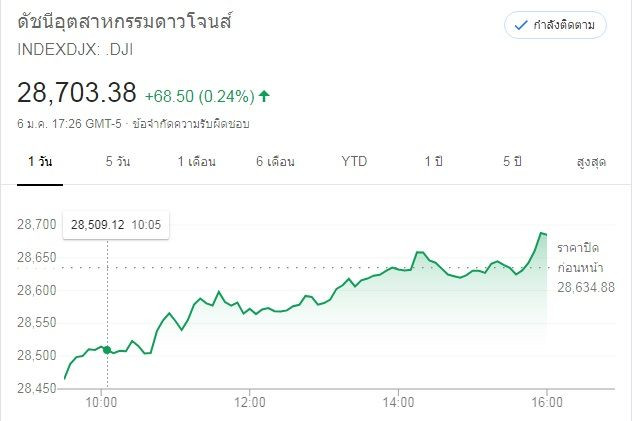 ดาวโจนส์ปิด+68.50 ที่ระดับ 28,703.38จุด น้ำมัน+22เซนต์ ที่ 63.27$ ทองคำ+38.63 ที่1,563.13$