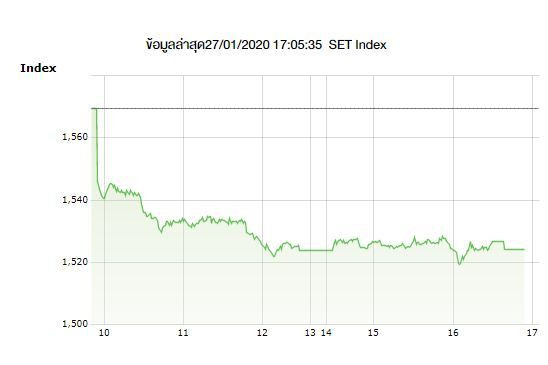 เมื่อวันที่ 27 ม.ค.63 ดัชนีหุ้นไทยเคลื่อนไหวในแดนลบตลอดทั้งวันก่อนปิดที่ระดับ 1,524.15 จุด ลดลง 45.40 จุด (-2.89%) มูลค่าการซื้อขาย 69,174.18 ล้านบาท โดยทำระดับสูงสุดที่ 1,548.11 จุด และทำระดับต่ำสุด 1,519.03 จุด