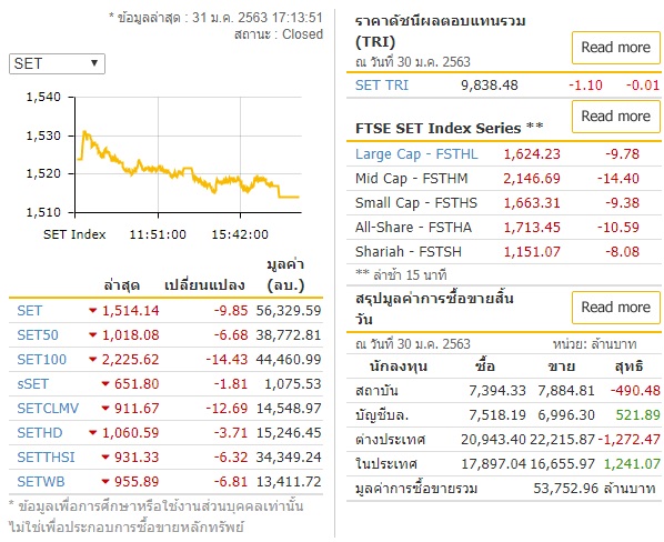 ตลาดหลักทรัพย์แห่งประเทศไทย วันที่ 31 ม.ค.2563 ปิดการซื้อขาย ดัชนีอยู่ที่ระดับ 1,514.14 จุด เปลี่ยนแปลง -9.85 จุด มูลค่าการซื้อขาย 56,329.59 ล้านบาท
