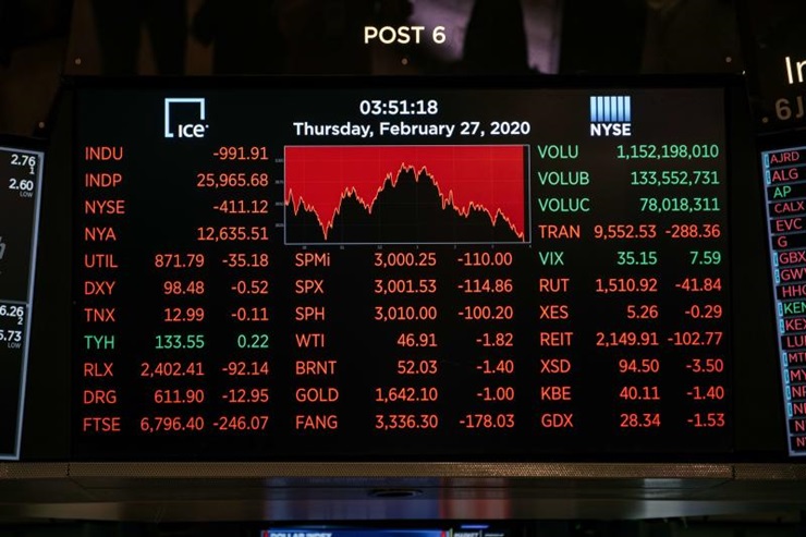 ดัชนีดาวโจนส์ตลาดหุ้นนิวยอร์กปิดร่วงหลุดจากระดับ 26,000 จุดเมื่อคืนนี้ (27 ก.พ.) ขณะที่ดัชนี เอสแอนด์พี 500 ดิ่งทะลุแนวรับทางจิตวิทยาที่ระดับ 3,000 จุด เนื่องจากนักลงทุนตื่นตระหนกต่อข่าวการแพร่ระบาดเป็นวงกว้างของไวรัสโควิด-19 โดยล่าสุดสหรัฐพบผู้ติดเชื้อรายแรกที่ไม่ทราบต้นตอของการติดเชื้อ ซึ่งอาจบ่งชี้ถึงการแพร่ระบาดในชุมชนเป็นครั้งแรกในสหรัฐ ขณะที่จำนวนผู้ติดเชื้อในประเทศต่างๆเพิ่มขึ้นอย่างรวดเร็ว ซึ่งรวมถึงเกาหลีใต้และอิหร่าน