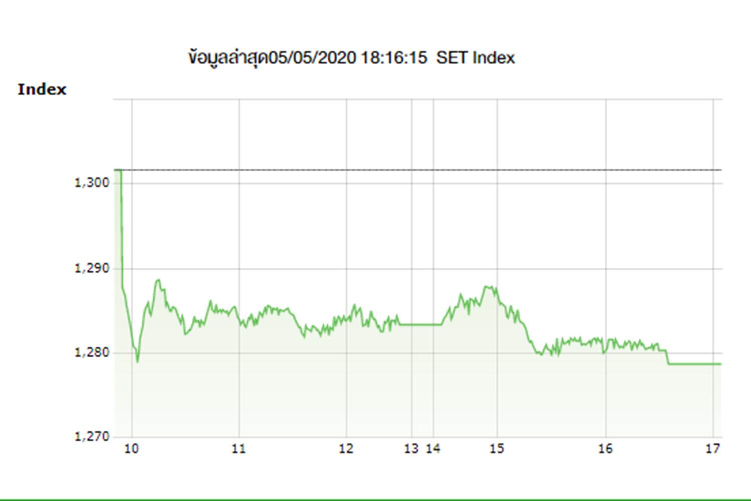 เมื่อวันที่ 5 พ.ค. 63 ตลาดหุ้นไทยเคลื่อนไหวในแดนลบตลอดทั้งวัน ก่อนปิดช่วงบ่ายที่ระดับ 1,278.63 จุด ลดลง 23.03 จุด (-1.77%) มูลค่าการซื้อขาย 51,384.94 ล้านบาท โดยดัชนีทำระดับสูงสุดที่ 1,289.09 จุด และทำระดับต่ำสุด 1,278.50 จุด