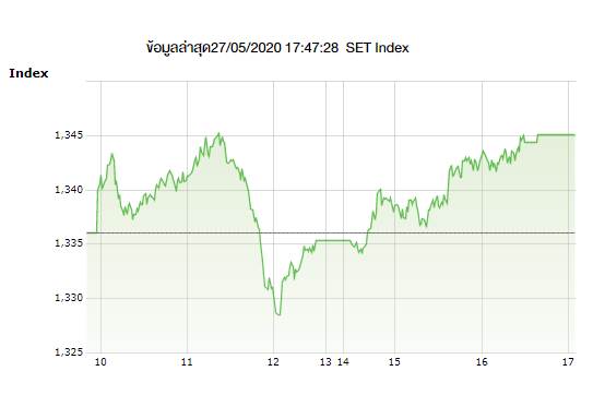 เมื่อวันที่ 28 พ.ค.63 ตลาดหุ้นไทยเคลื่อนไหวในแดนบวกเป็นส่วนใหญ่ ก่อนปิดช่วงบ่ายที่ระดับ 1,345.11 จุด เพิ่มขึ้น 9.02 จุด (+0.68%) มูลค่าการซื้อขาย 78,673.24 ล้านบาท โดยทำระดับสูงสุดที่ 1,345.53 จุด และทำระดับต่ำสุด 1,328.07 จุด