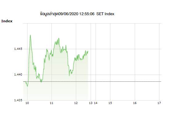 เมื่อวันที่ 9 มิ.ย. 63 ตลาดหุ้นไทยเคลื่อนไหวในแดนบวกเป็นส่วนใหญ่ก่อนปิดภาคเช้าที่ระดับ 1,444.63 จุด เพิ่มขึ้น 5.97 จุด (+0.41%) มูลค่าซื้อขายราว 52,265 ล้านบาท โดยดัชนีทำระดับสูงสุดที่ 1,448.13 จุด และทำระดับต่ำสุดที่ 1,437.26 จุด