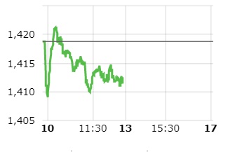 ตลาดหุ้นไทยวันที่ 11 มิ.ย. 2563 ปิดตลาดช่วงเช้า ดัชนีอยู่ที่ 1,412.45 จุด ลบ 6.32 จุด หรือ 0.45% มูลค่าการซื้อขาย 36,200.87 ล้านบาท