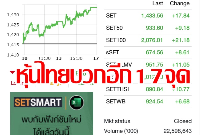 หุ้นไทยแรงไม่หยุดบวกอีก17จุด