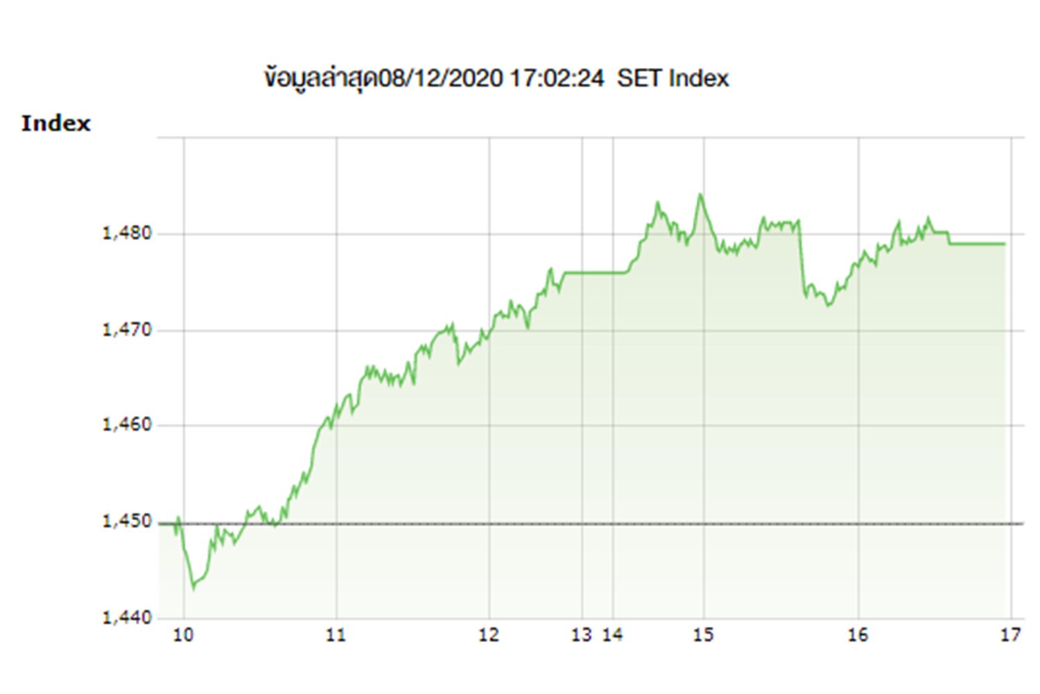หุ้นไทย 8 ธ.ค. 63 ดัชนีดีดตัวแรงกว่าตลาดต่างประเทศ ปิดที่ระดับ 1,478.92 จุด เพิ่มขึ้น 29.09 จุด มูลค่าการซื้อขาย 123,462.49 ล้านบาท