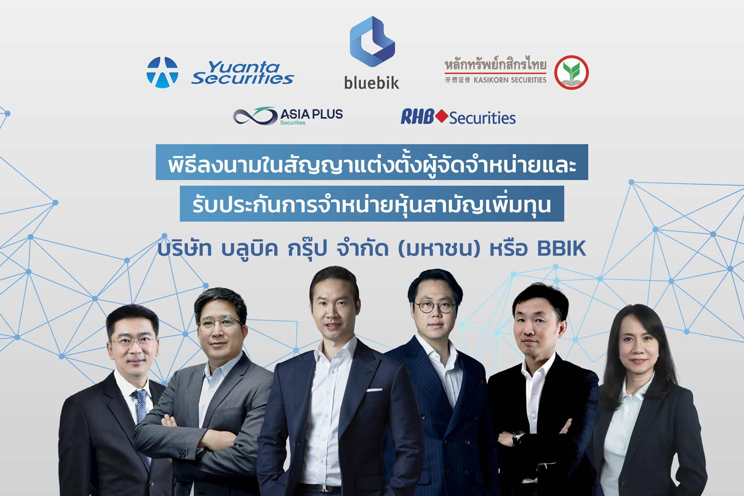 วันที่ 6 กันยายน 2564 - บริษัท บลูบิค กรุ๊ป จำกัด (มหาชน) หรือ BBIK ได้แต่งตั้ง บริษัทหลักทรัพย์ หยวนต้า (ประเทศไทย) จำกัด และ บริษัทหลักทรัพย์ กสิกรไทย จำกัด (มหาชน) เป็นผู้จัดการการจัดจำหน่ายและรับประกันการจำหน่าย พร้อมทั้งแต่งตั้ง บริษัทหลักทรัพย์ เอเซีย พลัส จำกัด บริษัทหลักทรัพย์ อาร์เอชบี (ประเทศไทย) จำกัด (มหาชน) เป็นผู้จัดจำหน่ายและรับประกันการจำหน่ายหุ้นสามัญเพิ่มทุน