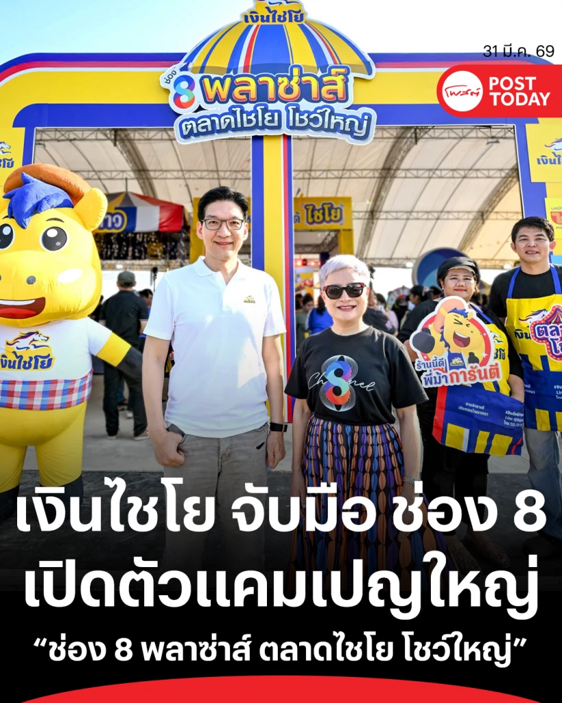 ‘เงินไชโย’ ผนึกกำลัง ‘ช่อง 8’ เปิดพื้นที่สร้างอาชีพในงาน ‘ช่อง 8 พลาซ่าส์ ตลาดไชโย โชว์ใหญ่’ ตอกย้ำบทบาท Trusted Partner เคียงข้างลูกค้าทุกจังหวะชีวิต