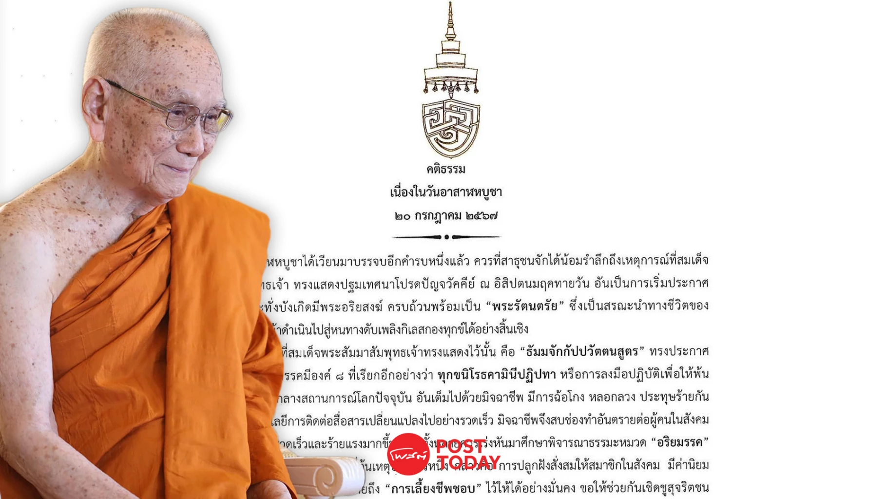 เมื่อวันที่ 20ก.ค.2567 สมเด็จพระอริยวงศาคตญาณ สมเด็จพระสังฆราช สกลมหาสังฆปริณายก ประทานพระคติธรรม เนื่องในวันอาสาฬหบูชา พ.ศ.2567 ความว่า