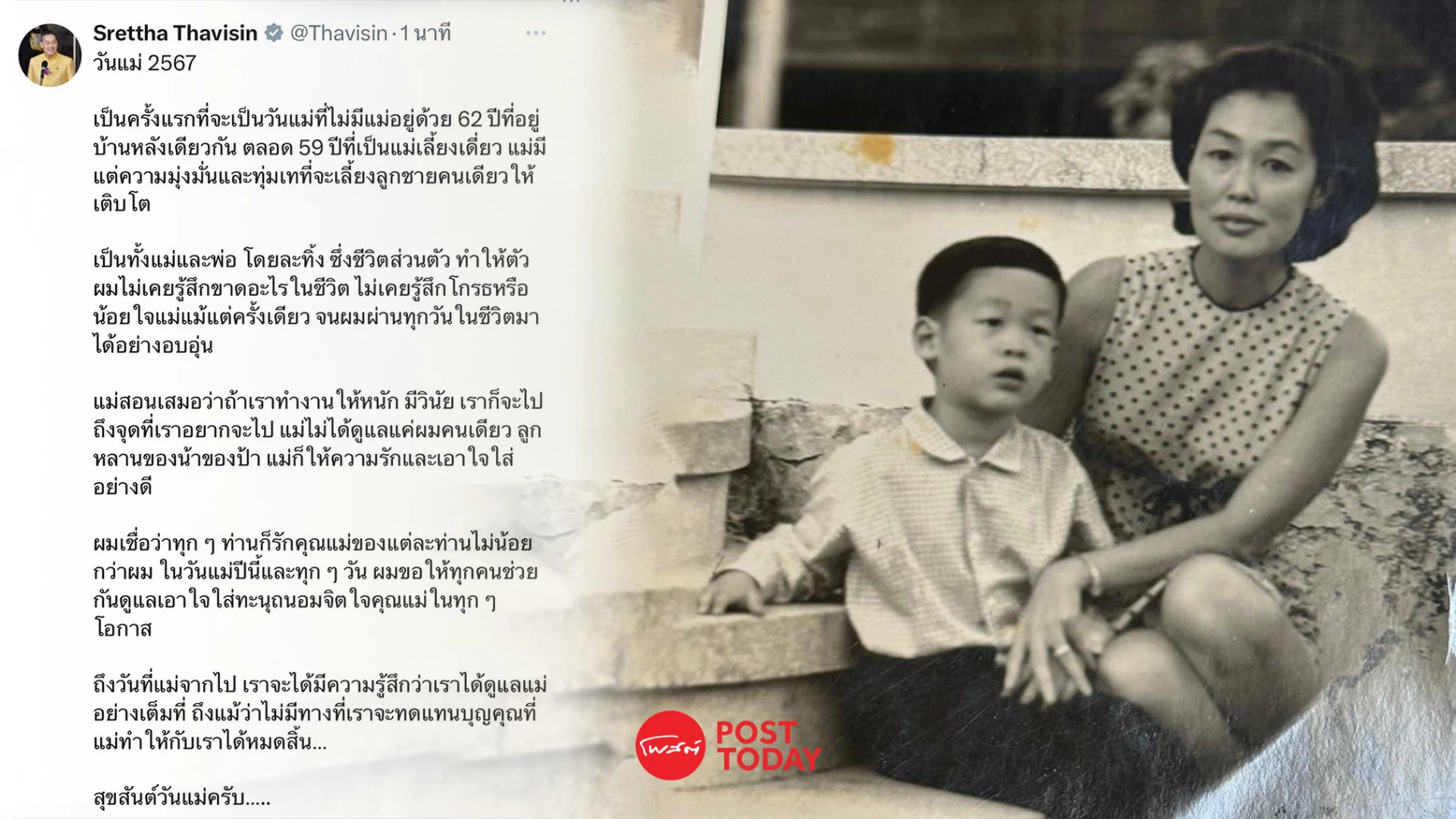 นายเศรษฐา ทวีสิน นายกรัฐมนตรี เผยแพร่ข้อความผ่านบัญชีผู้ใช้ @thavisin บนแอปพลิเคชัน X เนื่องในวันแม่แห่งชาติ 2567 โดยได้โพสต์รูปในวัยเด็ก คู่กับนางชดช้อย ทวีสิน มารดา พร้อมกับระบุข้อความว่า