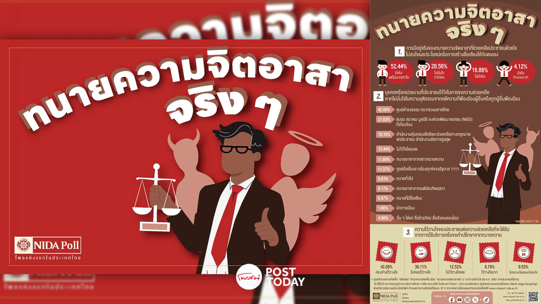 'นิด้าโพล'เผยประชาชน52.44%เชื่อทนายจิตอาสามีจริงแต่ไม่มาก