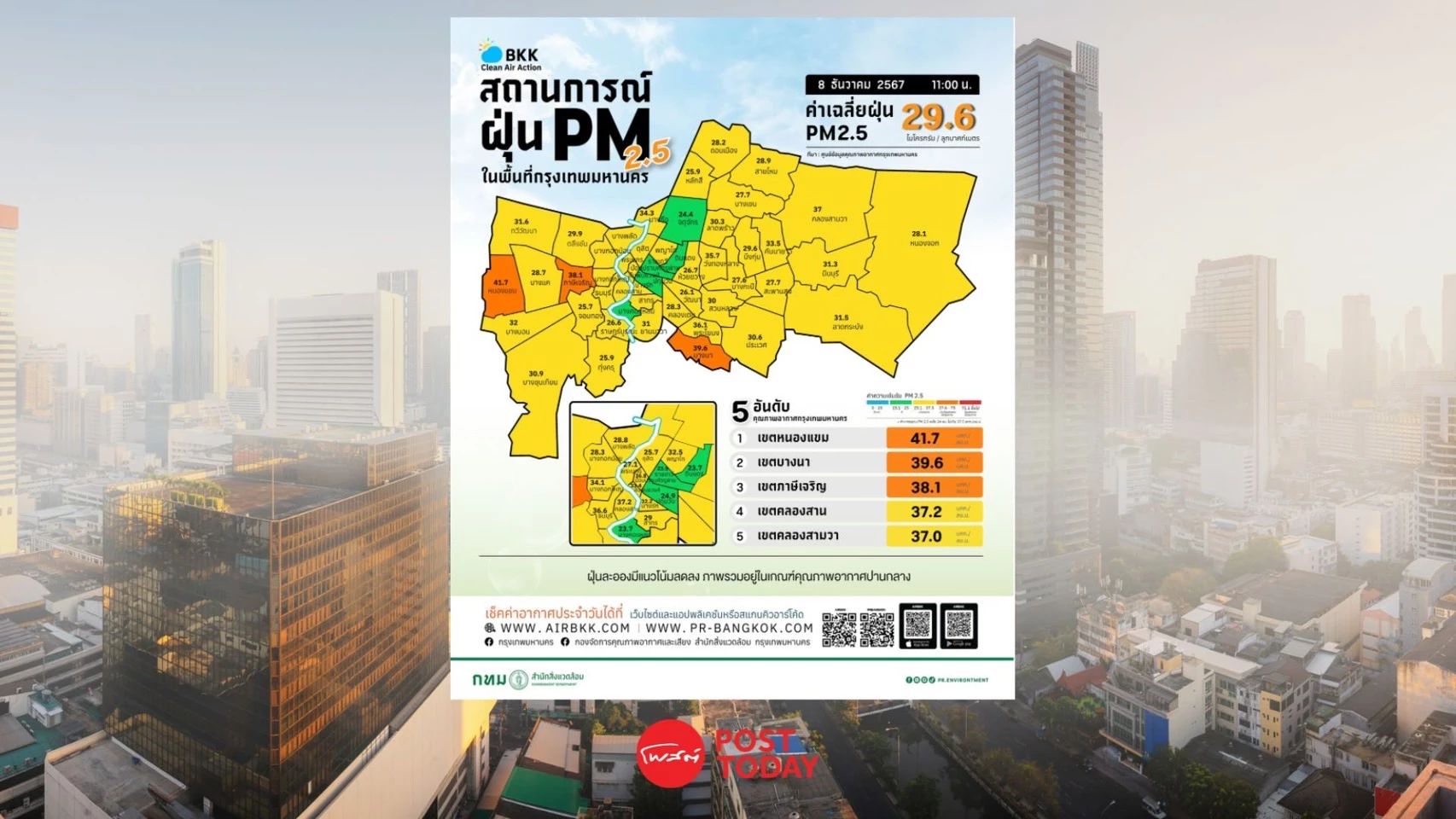 ค่าเฉลี่ยของกรุงเทพมหานคร 29.6 ไมโครกรัมต่อลูกบาศก์เมตร (มคก./ลบ.ม.)