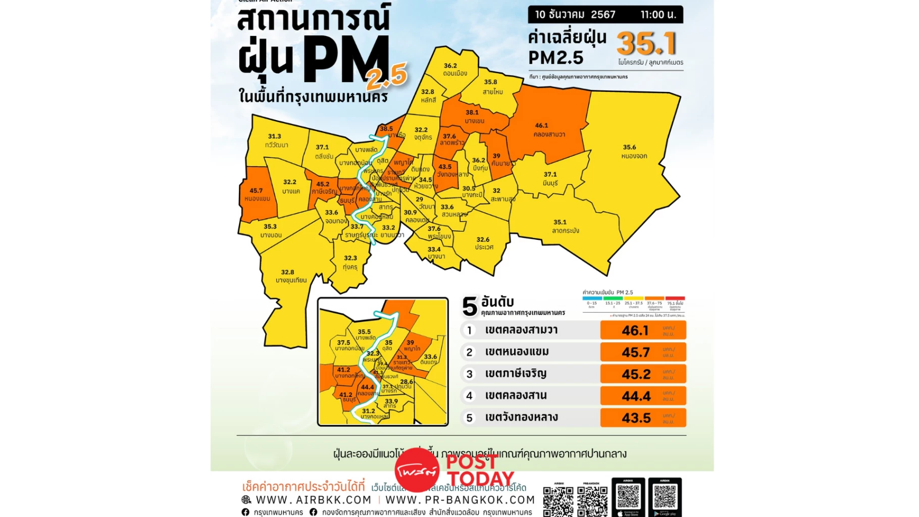 ศูนย์ข้อมูลคุณภาพอากาศ กทม.รายงานสถานการณ์ฝุ่นPM 2.5 ในกรุงเทพมหานคร ประจำวันที่ 10 ธันวาคม 2567 เวลา 11:00 น. อยู่ในระดับเกณฑ์สีส้มมีผลกระทบต่อสุขภาพ เขตคลองสามวาหนักสุด 46.1 มคก./ลบ.ม.