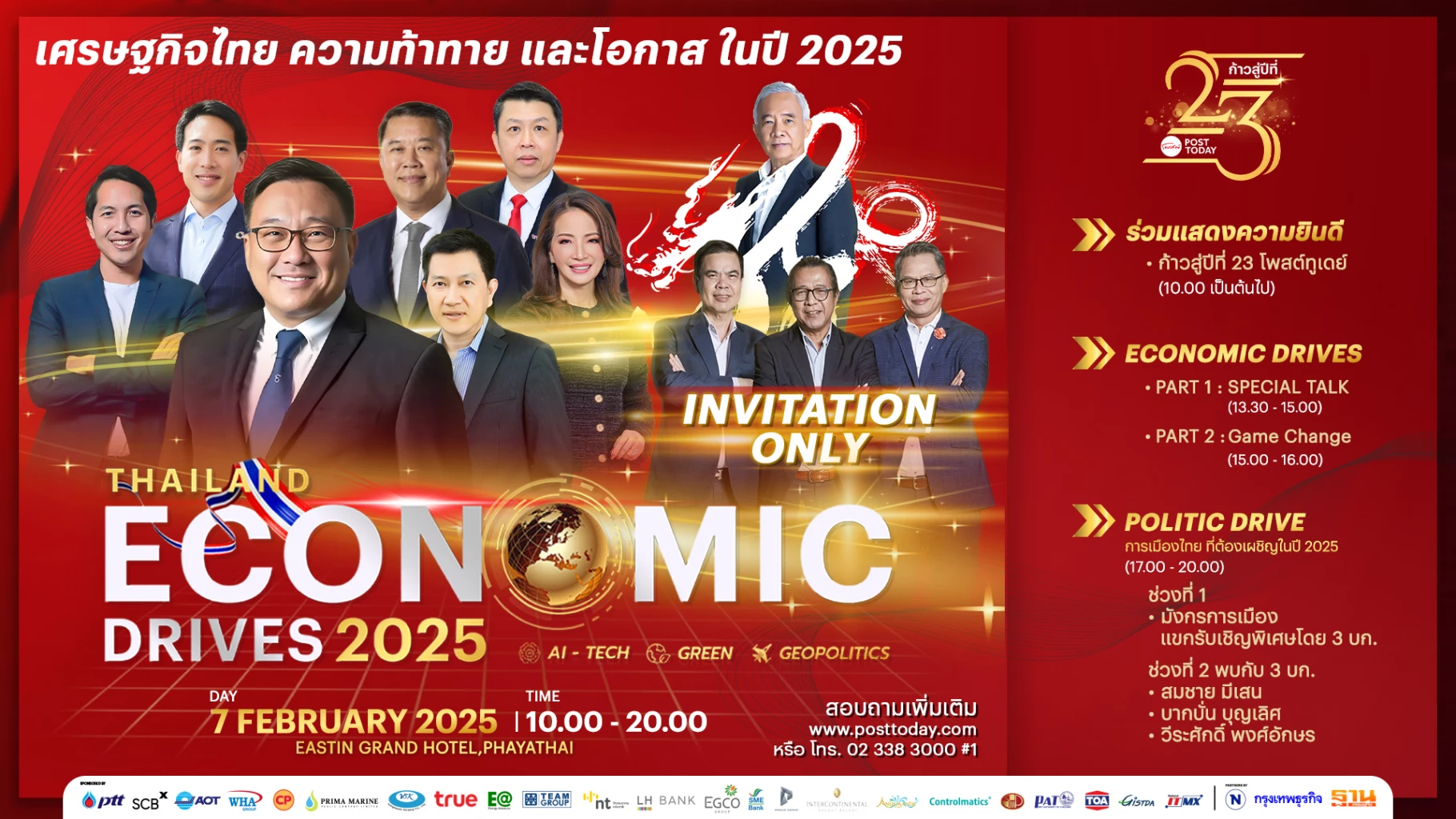 โพสต์ทูเดย์เตรียมจัดงานสัมมนาพิเศษ "Thailand Economic Drives 2025: Rising from the Transition" ในวันที่ 7 กุมภาพันธ์ 2568 ณ โรงแรมอิสติน แกรนด์ พญาไท กรุงเทพฯ เพื่อเฉลิมฉลองการก้าวเข้าสู่ปีที่ 23 ของการก่อตั้ง