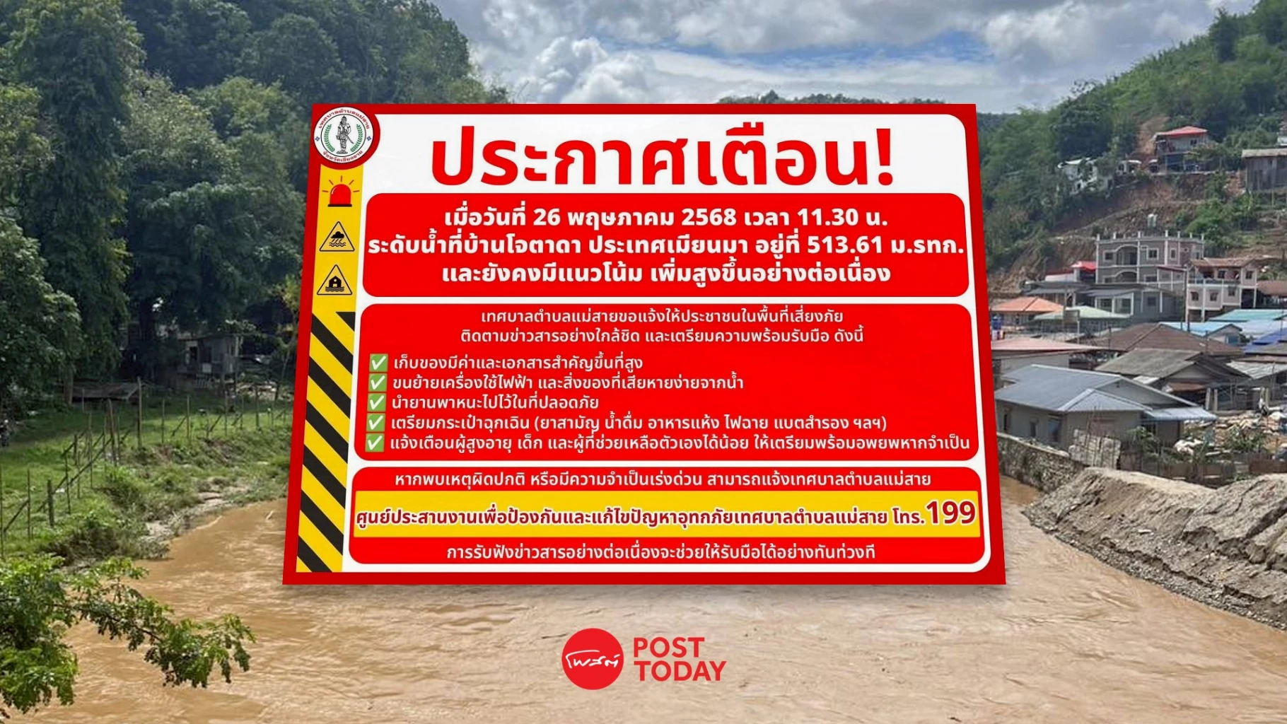 แม่สายเตือนภัยน้ำท่วม ระดับน้ำเมียนมามีแนวโน้มเพิ่มสูงขึ้นอย่างต่อเนื่อง ให้ประชาชนเร่งเตรียมพร้อมรับมือ
