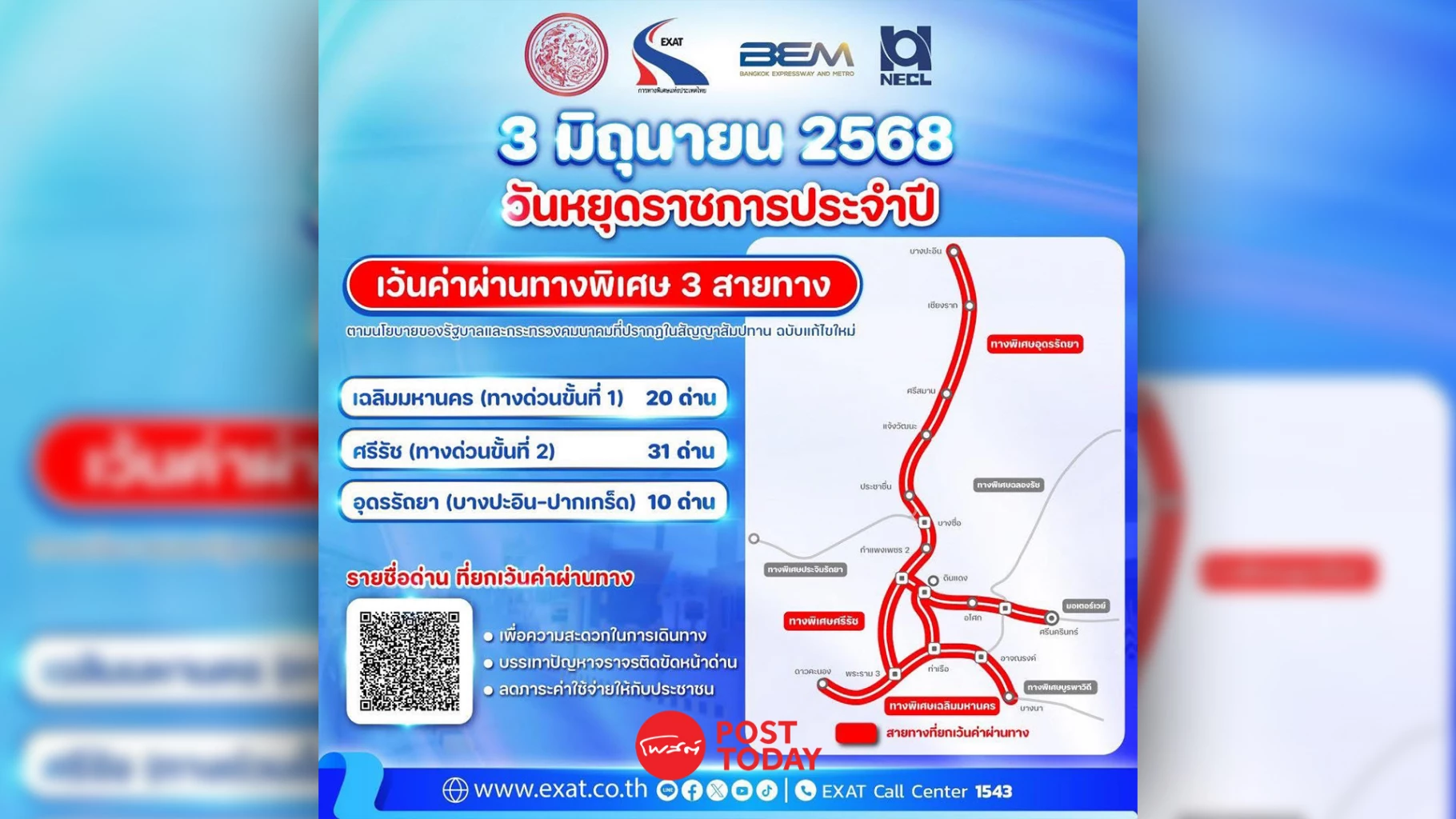 กทพ. ยกเว้นค่าผ่านทางพิเศษ 3 สายทาง 3 มิ.ย.นี้เพื่ออำนวยความสะดวกในการเดินทางในวันหยุด และช่วยลดภาระค่าใช้จ่ายประชาชน