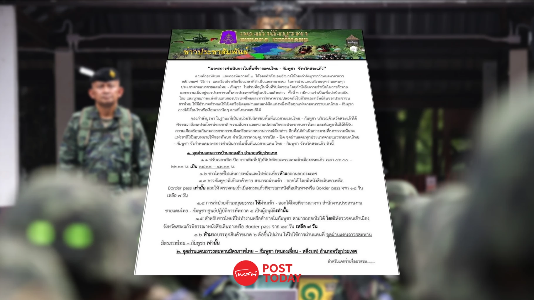 "กองกำลังบูรพา" ประกาศปรับเปลี่ยนเวลา เปิด-ปิด จุดผ่านชายแดนไทย-กัมพูชา จังหวัดสระแก้ว 5 จุด ท่องเที่ยว - เล่นพนันห้ามผ่าน