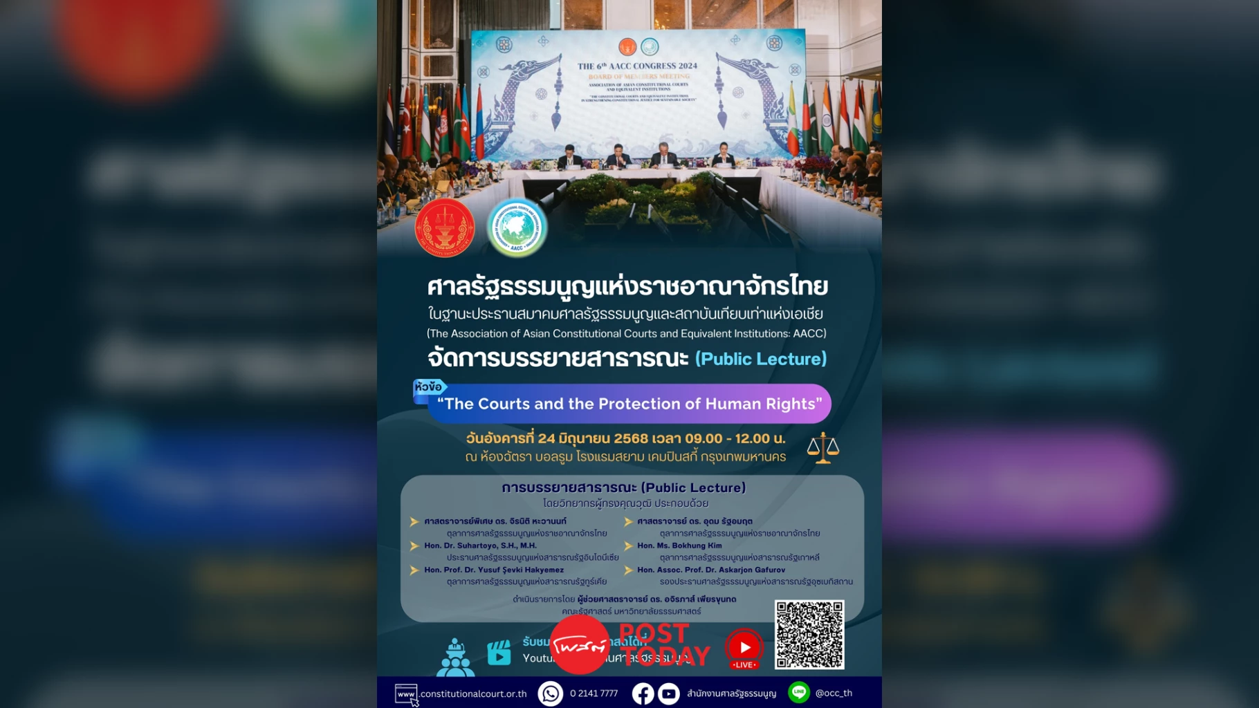 เมื่อวันที่ 20 มิถุนายน 2568 ศาลรัฐธรรมนูญแห่งราชอาณาจักรไทย ในฐานะประธานสมาคมศาลรัฐธรรมนูญและสถาบันเทียบเท่าแห่งเอเชีย (AACC) เตรียมจัดการประชุมคณะกรรมการสมาชิกสมาคม (Board of Members Meeting: BoMM) และการบรรยายสาธารณะ (Public Lecture) หัวข้อ “The Courts and the Protection of Human Rights” ณ โรงแรมสยาม เคมปินสกี้ กรุงเทพฯ ในวันที่ 24 มิถุนายน2568โดยมีผู้แทนจากศาลรัฐธรรมนูญและสถาบันตุลาการรัฐธรรมนูญจากประเทศสมาชิก AACC เข้าร่วม