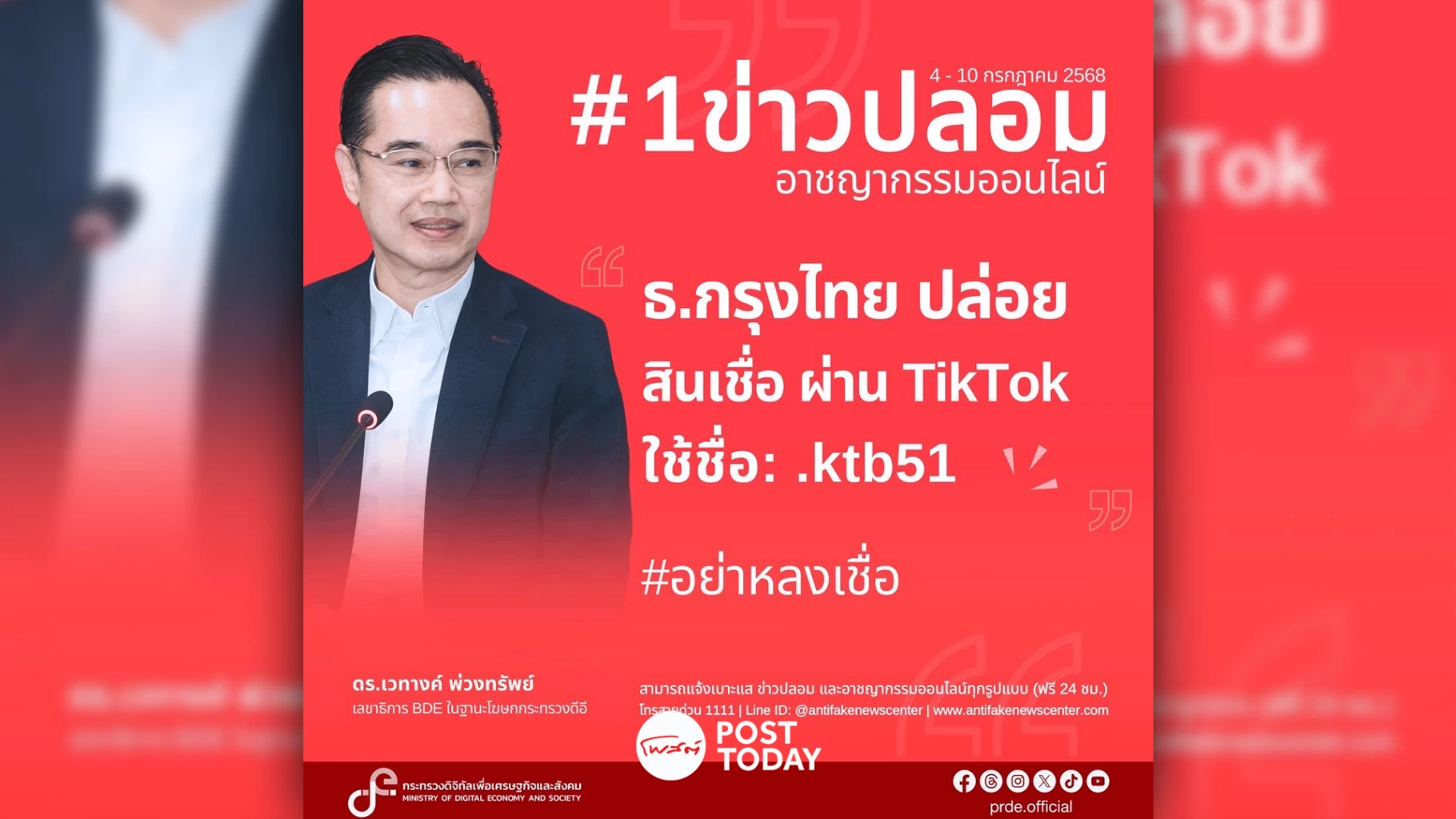 ดีอี เตือนภัย “มิจฉาชีพ” เปิดบัญชี TikTok ปลอม ลวงปล่อยสินเชื่อ “ธ.กรุงไทย” ระวังหลอกดูดเงิน-ข้อมูลส่วนบุคคล เช็ก 10 ข่าวปลอมเฝ้าระวัง