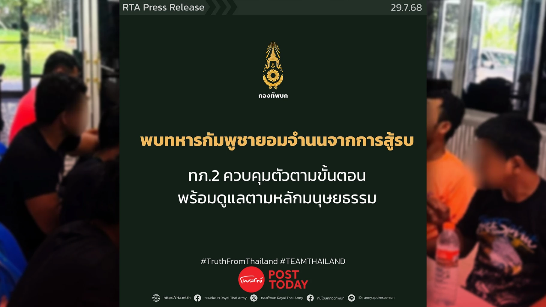 "กองทัพไทย" ตอบโต้ - กวาดล้างฐานที่มั่นกองทัพกัมพูชาคุมตัวทหารกัมพูชา 18 นาย บาดเจ็บ 1 นาย ไร้ท่าทีขัดขืน ยัน! ยึดหลักมนุษยธรรมในการดูแลและให้การรักษาพยาบาล