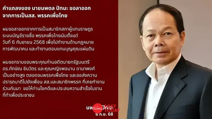 นายนพดล ปัทมะ สส.บัญชีรายชื่อ พรรคเพื่อไทย โพสต์เฟซบุ๊กส่วนตัว ขอลาออกจากการเป็น สส. พรรคเพื่อไทย โดยระบุว่า “ขอลาออกจากการเป็นสมาชิกสภาผู้แทนราษฎร ระบบบัญชีรายชื่อ พรรคเพื่อไทยนับตั้งแต่วันที่ 6 กันยายน 2568 เพื่อไปทำงานด้านกฎหมายการพัฒนาคน และทำงานตอบแทนบุญคุณแผ่นดิน