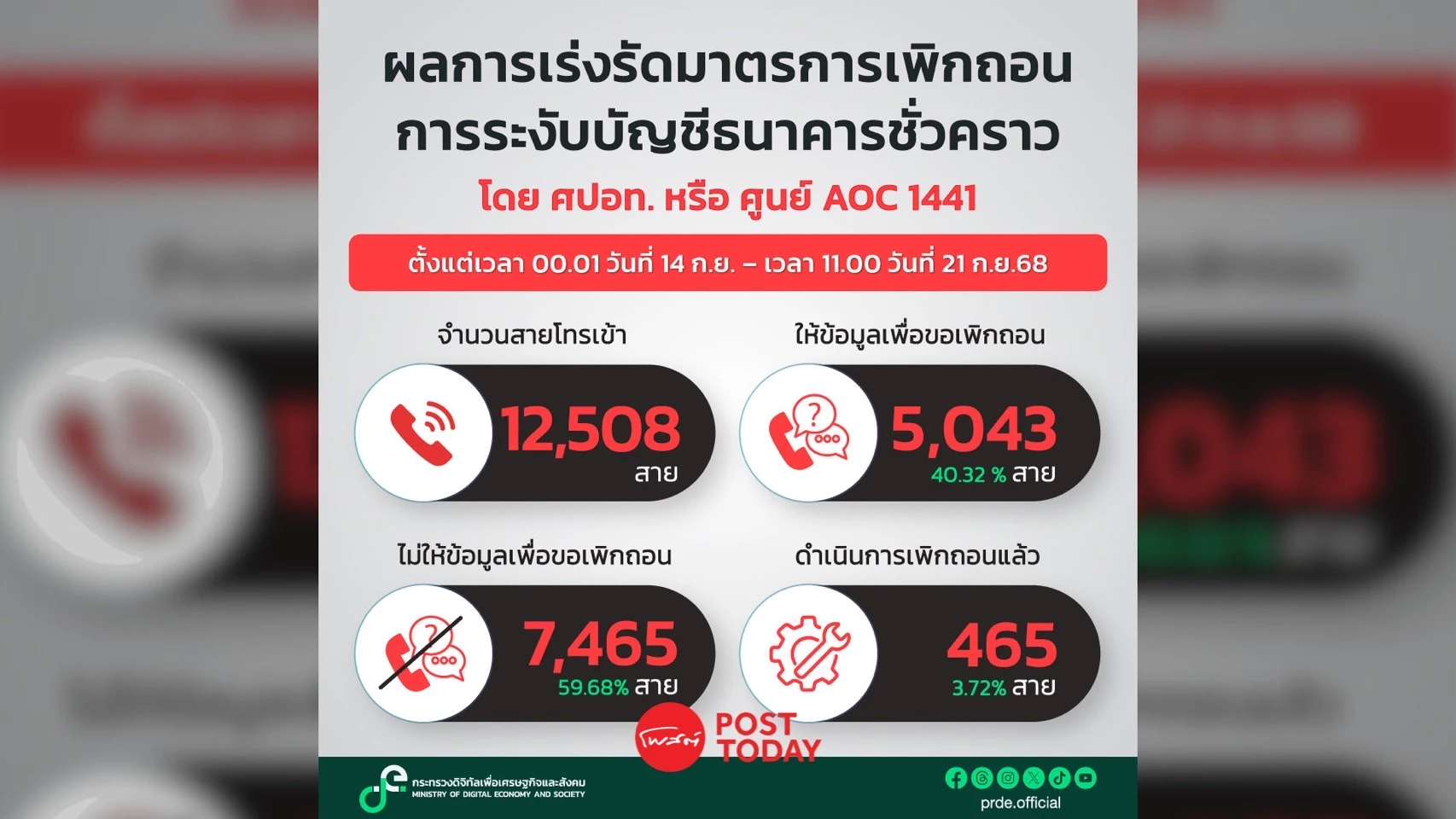 AOC สรุปผลการเร่งรัดมาตรการเพิกถอนการระงับบัญชีธนาคารชั่วคราว ตั้งแต่เวลา 00.01 วันที่ 14 ก.ย. – เวลา 11.00 วันที่ 21 ก.ย.68 จำนวนสายโทรเข้า 12,508 สาย เพิกถอน 465 สาย