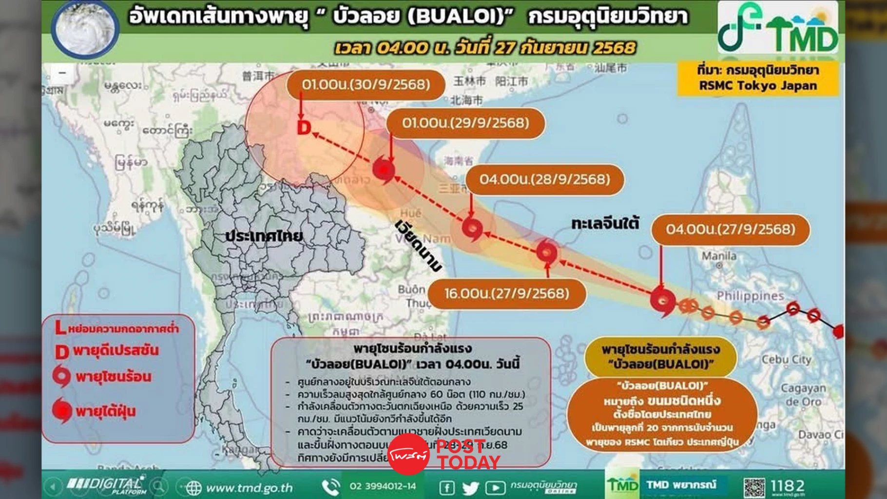 กรมอุตุนิยมวิทยาประกาศ พายุ “บัวลอย” ส่งผลให้ในช่วงวันที่ 28–30 ก.ย. 68 ทำให้ประเทศไทยมีฝนตกหนักหลายพื้นที่