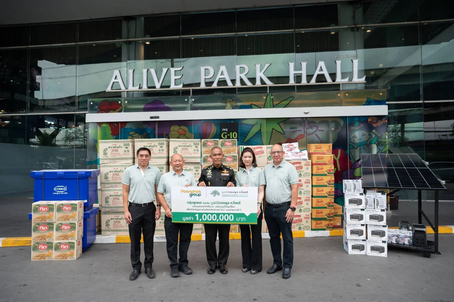 Power box จำนวน 28 ชุด, Power Station พร้อม Solar cell จำนวน 10 ชุด, เครื่องคำนวณการยิง จำนวน 22 เครื่อง, ถังน้ำแข็ง จำนวน 21 ถัง, น้ำมันพืชตรากุ๊ก จำนวน 100 ลัง รวมถึงผลิตภัณฑ์สินค้าบริโภคในกลุ่มพูลผลโดย บริษัท พูลผล จำกัด , บริษัท ซี.อี.เอส. จำกัด และ บริษัท สิทธินันท์ จำกัด เพิ่มเติมกว่า 60 ลัง เช่น วุ้นเส้นต้นถั่ว , ซอสสุกี้ เป็นต้น รวมมูลค่าทั้งสิ้น 1,000,000 บาท