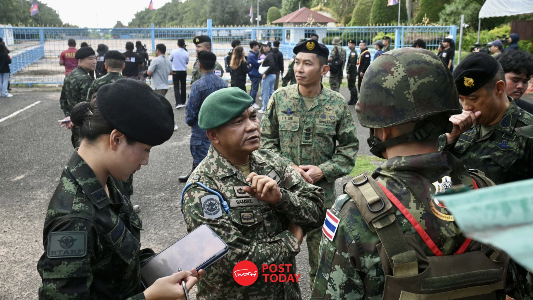 กองทัพไทย และกองทัพภาคที่ 2 นำคณะผู้สังเกตการณ์ชั่วคราว IOT 3 ประเทศ บรูไน มาเลเซีย สิงคโปร์ ลง พื้นที่ช่องสายตะกู ต.จันทบเพชร อ.บ้านกรวด จ.บุรีรัมย์ บริเวณรั้วชายแดน ใกล้แนวเส้นปฏิบัติการ