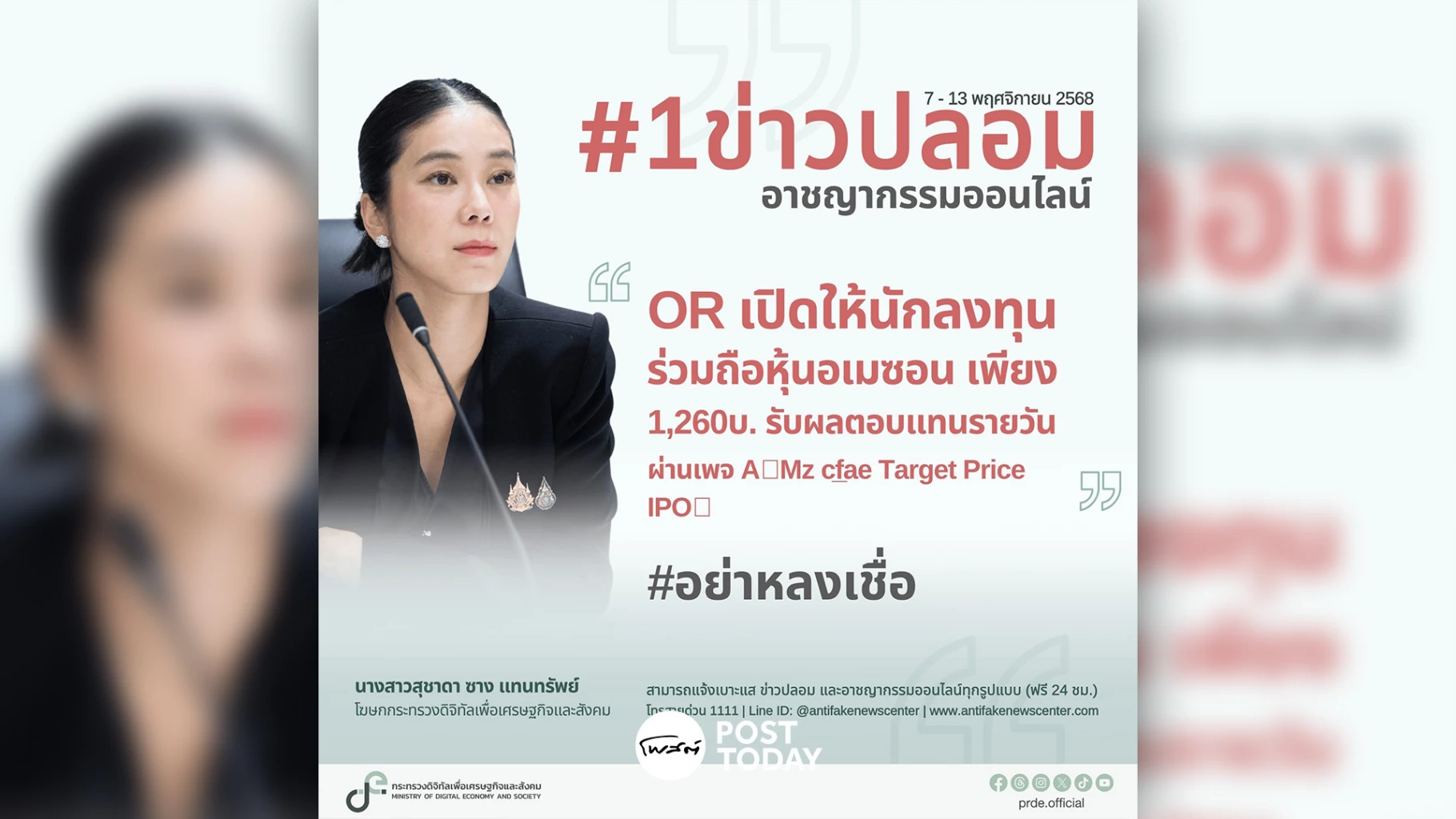 สำหรับอันดับ 1 เรื่อง "OR ชวนร่วมถือหุ้นอเมซอน" กระทรวงดีอี ได้ประสานไปยัง บริษัท ปตท. น้ำมันและการค้าปลีก จำกัด (มหาชน) หรือ OR และตรวจสอบพบว่าเป็น "ข้อมูลเท็จ" โดยยืนยันว่า OR ไม่มีนโยบายเสนอขายหุ้นหรือเชิญชวนลงทุนในลักษณะดังกล่าว และเพจเฟซบุ๊กดังกล่าวเป็นของกลุ่มมิจฉาชีพ