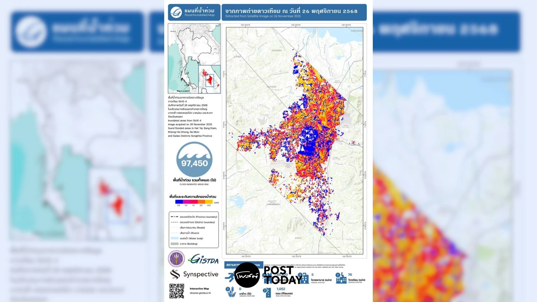 GISTDA เผยภาพดาวเทียม 26 พ.ย. พบน้ำท่วมสงขลา 5 อำเภอ รวม 97,450 ไร่ น่าห่วงระดับน้ำลึกสูงสุดกว่า 2.5 เมตร เป็นอุปสรรคต่อการกู้ภัย เร่งส่งข้อมูลช่วยด่วน